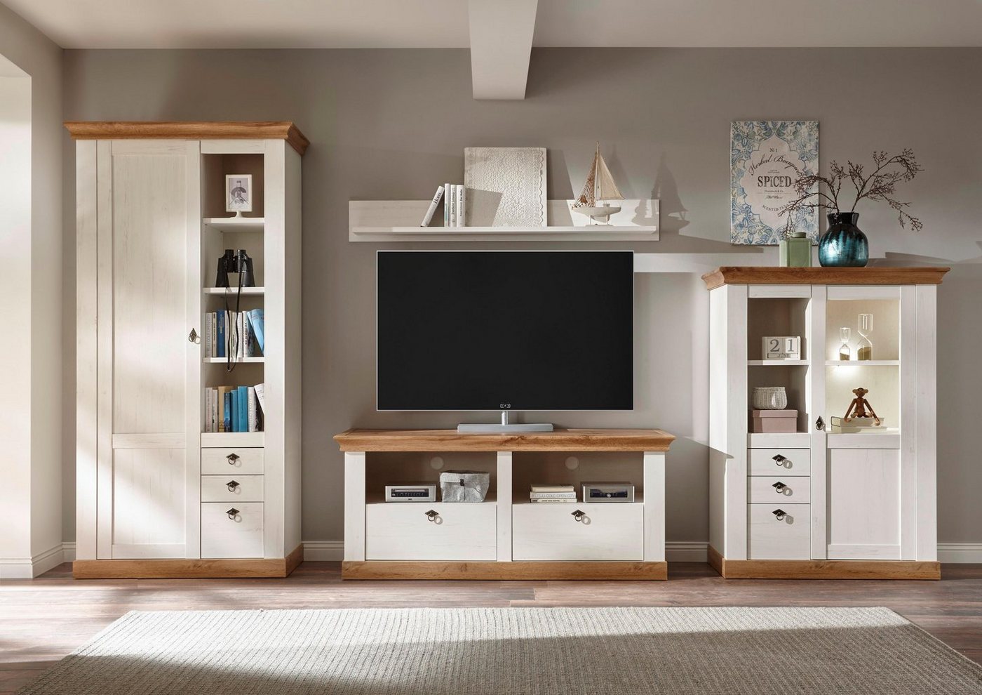 Elegantes Design: Die Wohnwand »Cremona« mit dekorativer Rahmenoptik von Home affaire bietet einen ansprechenden Anblick. Ihre Gestaltung passt gut zum Landhaus-Stil und kann auch moderne Einrichtungskonzepte bereichern. Sie besteht aus mehreren Komponenten, die sich in unterschiedlichen Anordnungen im Raum platzieren lassen. Zur Wohnkombinationen gehören ein Stauraumschrank, ein Lowboard, eine Stauraumvitrine und ein Wandregal. Die Möbel werden aus FSC®-zertifiziertem Holzwerkstoff angefertigt. Dabei achtet der Hersteller auf eine hochwertige Verarbeitung. In den Schubladen und Fächern ist viel Platz für Geschirr, Bücher oder Elektronik vorhanden. Mit der Wohnwand »Cremona« in dekorativer Rahmenoptik von Home affaire wird jede Einrichtung stilvoll bereichert.