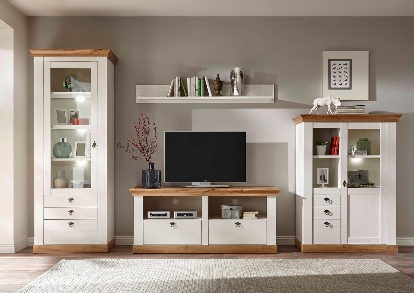 Mit der Wohnwand »Cremona« von Home affaire in dekorativer Rahmenoptik erhält das Interieur einen Hingucker. Schlichte Farben und formschöne Griffe zeichnen das ansprechende Design aus. Mit ihrem Landhaus-Look passen die Wohnzimmermöbel in verschiedene Einrichtungen. Die Vitrine ist mit einer Glastür versehen, hinter der sich Einlegeböden für Geschirr, Vasen und Deko-Objekte befinden. In den Schubladen unterhalb lassen sich Dokumente verstauen. Ausgestattet mit offenen Fächern und Schubkästen, stellt das Lowboard genügend Stauraum für DVDs, elektronische Geräte und Fernbedienungen zur Verfügung. Das Wandregal eignet sich für Dekorationen mit Bilderrahmen und Kerzenhaltern. Komplettiert wird die Wohnkombination durch eine praktische Stauraumvitrine, die dank mehrerer Fächer und Schubkästen weiteren nützlichen Platz bietet. Die Wohnzimmerschränke sind hochwertig verarbeitet und werden aus Holzwerkstoff gefertigt. Ein Blickfang im Zuhause: die Wohnwand »Cremona« von Home affaire in dekorativer Rahmenoptik.