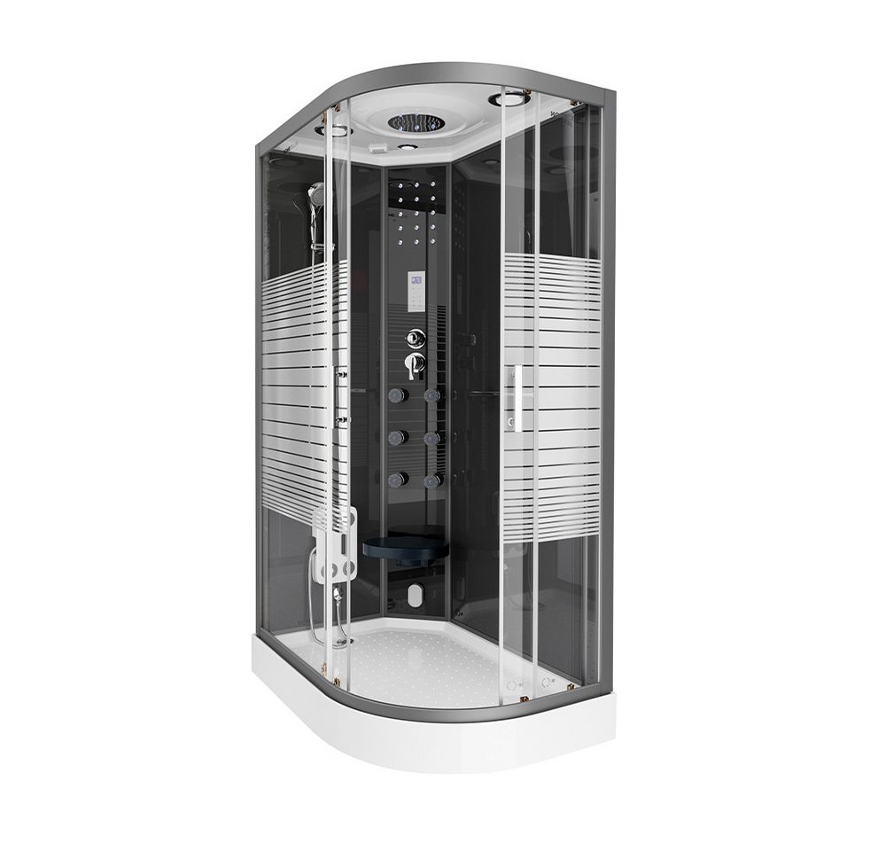 Die Pearl-Serie ist der absolute Hingucker in jedem Badezimmer Diese Design-Dampfduschkabine ist ein wahres Multifunktions- und Raumsparwunder. Verlieren Sie z.B. nach einem mühsamen Arbeitstag Ihren Stress bei einem angenehmen Dampfsaunagang (bis 60 °C einstellbar), bei dem Sie garantiert ins Schwitzen kommen. Optional besteht die Möglichkeit, ein Duftaroma von himmlischer Intensität (z. B. Eukalyptus, Minze u.v.a.) zu integrieren. Die ",",Pearl-Serie",", verfügt außerdem über die Regenbrausenoption, bei der Wasser wie ein lauwarmer Tropenregen aus den unglaublichen 126 Düsen im Deckenhimmel rieselt. Eine entspannte Rückenmassage (6 Hydrojets) mit gleichzeitigem Lauschen Ihres Lieblingsradiosenders ist bei vielen Kunden beliebt. Selbstverständlich ist auch der gewöhnliche Gebrauch über eine Handbrause, die über die befestigte Duschstange justierbar ist, möglich. Die 15 blauen LED-Lichter im Mittelpaneel machen den ",",Wohlfühlfaktor",", vollkommen. Über das integrierte Computerdisplay können Sie die Lautstärke und Senderwahl stufenlos regeln. Der im Mittelpaneel aufklappbare Sitz (max. Belastung ca. 100 kg) und die Antirutschstruktur im Wannenboden gewährleisten den sicheren Gebrauch dieser Duschkabine. Sowohl die 4 mm schwarzgetönte ESG-Vollverglasung aller Komponenten, als auch die Aluminium-Rahmenkonstruktion stehen für den durchweg hohen Qualitätsstandard. Die hochmoderne Teilsatinierung schafft sowohl Diskretion, als auch Lichtdurchlässigkeit. Die auf fast jeden Untergrund anzupassenden höhenverstellbaren Füße der Duschwanne sind ein weiteres herausragendes Feature, das diese Dusche von anderen hervorhebt. Alles in allem ist die Black Pearl eine sehr gute Dampfduschkabine mit einem herausragenden Preis-/Leistungsverhältnis! PRODUKTBESCHREIBUNG – sehr geräuscharmer Schiebelauf- Schiebetüren schließen durch die integrierten Magnetleisten bequem und dicht (Soft-Close Mechanismus)- Jetzt neu! Mit verbesserter Rollenführung- Bedienelement für Radio-/Lichtfunktion und Abluft- integrierte Fußmassage als Reflexzonentherapie anwendbar- integriertes Ozondesinfektionssystem sorgt für rückstandslose, umweltfreundliche Reinigung- FI-Sicherheitsschalter- pflegeleichte Oberfläche- einfacher Austausch einzelner Komponenten bei eventuellem Verschleiß- einfache Montage und Handhabung LIEFERUMFANG – Dampfdusche BLACK PEARL 120 x 80 cm Rechts- Lüfter für eine Installation an einem Dampfabzug enthalten- flexibler Abwasseranschluss (HT 40 mm als Ziehharmonikaschlauch) wird mitgeliefertBitte beachten: 2x 1/2",", Flexschläuche mit Überwurfmutter werden benötigt (in nahezu jedem ortsansässigen Baumarkt kostengünstig erhältlich) – Verpackung: in 4 handlichen Kartons, sicher verpackt und auf Vollständigkeit überprüft- Paketmaße: Karton 1 193 x 36 x 20 cm, Karton 2 123 x 83 x 25 cm, Karton 3 193 x 93 x 5 cm, Karton 4 193 x 63 x 8 cm, Karton 5 30 x 30 x 15 cm DAMPFDUSCHE BLACK PEARL – DATEN – bitte messen Sie nach, ob diese Dampfduschkabine in den vorgesehenen Raum passt- Mindestraumhöhe: ca. 235 cm werden für einen problemlosen Aufbau benötigt- ideal wäre ein gefliester Untergrund, aber er ist nicht zwingend notwendig, sondern eine Empfehlung- Sie benötigen einen Wasserablauf und Warm-/Kaltwasseranschluss- 1x gewöhnliche 220 V-Steckdose, wenn Sie die Dampfsaunafunktion, die Beleuchtung und das Radio nutzen möchten, sonst auch ohne benutzbar- Stromanschluss: 220-240 V, 50/60 Hz (35W ohne Dampffunktion, 3000 W bei Dampfsauna, d.h. 1h Dampfsauna kostet Sie Ø nur 77,1 ct, Stand 2012)- 4 höhenverstellbare Füße, so dass die Duschwanne ca. 2 cm hoch- bzw. herunterschraubbar ist- arbeitet auch mit Durchlauferhitzer- Maße (BxTxH): 120 x 80 x 220 cm- Innenraumhöhe: ca. 195 cm- Einstiegshöhe: ca. 20 cm mit Rahmen- Einstiegsbreite: ca. 50 cm- Schenkellänge: ca. 82,5 cm ELEKTRO- UND ELEKTRONIKGERÄTE – INFORMATIONEN FÜR PRIVATE HAUSHALTE Das Elektro- und Elektronikgerätegesetz (ElektroG) enthält eine Vielzahl von Anforderungen an den Umgang mit Elektro- und Elektronikgeräten. Die wichtigsten sind hier zusammengestellt.1. Getrennte Erfassung von AltgerätenElektro- und Elektronikgeräte, die zu Abfall geworden sind, werden als Altgeräte bezeichnet. Besitzer von Altgeräten haben diese einer vom unsortierten Siedlungsabfall getrennten Erfassung zuzuführen. Altgeräte gehören insbesondere nicht in den Hausmüll, sondern in spezielle Sammel- und Rückgabesysteme.2. Batterien und AkkusBesitzer von Altgeräten haben Altbatterien und Altakkumulatoren, die nicht vom Altgerät umschlossen sind, im Regelfall vor der Abgabe an einer Erfassungsstelle von diesem zu trennen. Dies gilt nicht, soweit die Altgeräte bei öffentlich-rechtlichen Entsorgungsträgern abgegeben und dort zum Zwecke der Vorbereitung zur Wiederverwendung von anderen Altgeräten separiert werden.3. Möglichkeiten der Rückgabe von AltgerätenBesitzer von Altgeräten aus privaten Haushalten können diese bei den Sammelstellen der öffentlich-rechtlichen Entsorgungsträger oder bei den von Herstellern oder Vertreibern im Sinne des ElektroG eingerichteten Rücknahmestellen abgeben. Ein Onlineverzeichnis der Sammel- und Rücknahmestellen finden Sie hier: https://www.ear-system.de/ear-verzeichnis/sammel-und-ruecknahmestellen.jsf4. Datenschutz-HinweisAltgeräte enthalten häufig sensible personenbezogene Daten. Dies gilt insbesondere für Geräte der Informations- und Telekommunikationstechnik wie Computer und Smartphones. Bitte beachten Sie in Ihrem eigenen Interesse, dass für die Löschung der Daten auf den zu entsorgenden Altgeräten jeder Endnutzer selbst verantwortlich ist.5. Bedeutung des Symbols „durchgestrichene Mülltonne“Das auf den Elektro- und Elektronikgeräten regelmäßig abgebildeten Symbol einer durchgestrichenen Mülltonne weist darauf hin, dass das jeweilige Gerät am Ende seiner Lebensdauer getrennt vom unsortierten Siedlungsabfall zu erfassen ist.6. Hersteller-Re