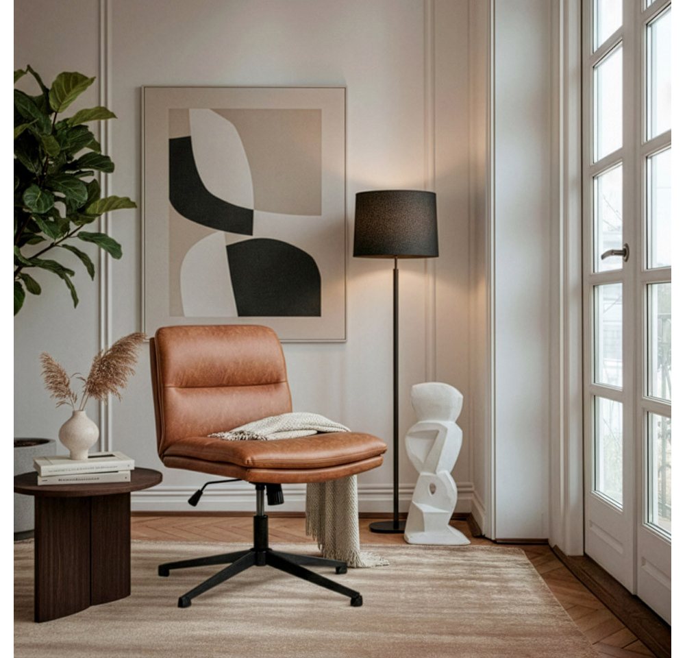 Retro-Drehstuhl LUYA in Braun/Cognac – Stil, Komfort und Funktion in einem Der Retro-Drehstuhl LUYA kombiniert zeitlosen Stil mit höchstem Sitzkomfort und praktischer Funktionalität. Der elegante PU-Lederbezug in Braun/Cognac verleiht deinem Zuhause oder Büro sofort Wärme und Charakter und macht den Stuhl zu einem echten Design-Highlight für Liebhaber klassischer Eleganz mit modernem Touch. Die ergonomisch geformte Sitzfläche bietet optimalen Halt und angenehmen Komfort, selbst bei längerem Sitzen. Das robuste Metallgestell garantiert Stabilität und Langlebigkeit, während die praktische Drehfunktion mit Rückholmechanismus sowie die stufenlose Höhenverstellung für maximale Flexibilität und Bedienfreundlichkeit sorgen. Ob im Homeoffice, am Schreibtisch oder am Esstisch – der LUYA passt sich deinen individuellen Bedürfnissen an und bietet dabei ein Höchstmaß an Komfort und Funktionalität. Mit seinem einzigartigen Mix aus Retro-Charme und modernem Industrial-Design ist der Drehstuhl LUYA mehr als nur ein Sitzmöbel – er setzt ein stilvolles Statement für Qualität, Geschmack und Wohnambiente. Gönn dir den Retro-Drehstuhl LUYA und wertet jeden Raum mit einem zeitlosen, eleganten Akzent auf. Produkteigenschaften Edles Kunstleder in elegantem Cognac – robust, pflegeleichtDie geschwungene Sitzform sorgt für optimalen Halt und hohen KomfortDas solide, pulverbeschichtete Metallgestell garantiert Stabilität, LanglebigkeitDank der praktischen Drehfunktion und automatischen Rückstellung kehrt der Stuhl nach Gebrauch elegant in seine Ausgangsposition zurückEinfach anpassbar an verschiedene TischhöhenDie Kombination aus Lederoptik und Metall verleiht dem Stuhl einen stilvollen Vintage-Charme Technische Daten Maße (H x B x T): 80-90 x 72 x 62 cmHöhenverstellbar: 80-90 cmFarbe: Braun/CognacFarbe Gestell: SchwarzMaterial: PU LederMaterial Gestell: MetallBelastbarkeit: max. 120 kgGewicht: 12,2 kg Lieferumfang 1 x Retro-Drehtstuhl LUYAPaketmaße: 62 x 57 x 33 cmPaketgewicht: 14,5 kg