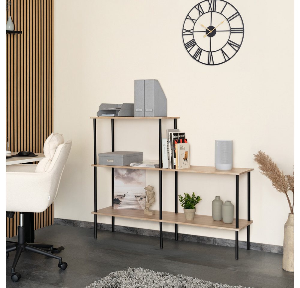 Optimales Regalsystem für jeden Raum: Klassisch-modernes Design mit zusätzlichen Sicherheitsmerkmalen. Unser klassisch-modernes Regalsystem INDU überzeugt durch seine vielseitige Einsetzbarkeit und hochwertige Verarbeitung. Die Kanten sind zusätzlich versiegelt und die Ecken abgerundet, was nicht nur für ein elegantes Erscheinungsbild sorgt, sondern auch die Sicherheit erhöht – ideal für Haushalte mit Kindern. Dank dieser Features passt das Regalsystem perfekt in jedes Wohnzimmer, Arbeitszimmer, die Küche, das Bad oder den Flur. Die einfache Montage unseres Regalsystems spart Zeit und Mühe, sodass du schnell von viel Stauraum profitieren kannst. Egal ob zusätzlicher Stauraum im Wohnzimmer, eine organisierte Lösung im Arbeitszimmer oder praktische Ablageflächen in Küche und Bad benötigt werden – unser Regalsystem erfüllt alle diese Anforderungen.Erlebe die Kombination aus Funktionalität und ästhetischem Design und schaffe Ordnung in deinem Zuhause. Kanten zusätzlich versiegelt und Ecken abgerundetKlassisch-modernes RegalsystemEinfache MontageViel StauraumVielfältig einsetzbar in Wohnzimmer, Arbeitszimmer, Küche, Bad oder Flur. Maße (L x B x H): 140 x 35 x 110 cm Material: MDF PlatteMaterial Stärke: 15 mmFarbe: Light OakMetallstreben: StahlMetallstreben Stärke: 22 mmMetallstreben Ø: 0,8 mmGewicht: 12 kg 1 x Regal Light OakPaketmaße ( L x B x H): 145,5 x 40,5 x 8 cm