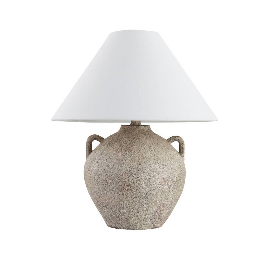Die große Tischlampe RITA vereint natürliche Ästhetik mit modernem Design und sorgt für eine warme, gemütliche Atmosphäre in deinem Zuhause. Der robuste Fuß in rustikaler Steinoptik verleiht der Lampe eine authentische, erdige Note, während der weiße Stoffschirm ein sanftes, blendfreies Licht verbreitet. Durch die harmonische Kombination aus natürlichen Farben und hochwertigen Materialien setzt RITA stilvolle Akzente und passt perfekt in verschiedene Wohnstile – ob als dekorative Beleuchtung im Wohnzimmer, elegante Tischlampe auf der Kommode oder als gemütliche Nachttischlampe im Schlafzimmer. Dank der stabilen Verarbeitung überzeugt RITA nicht nur optisch, sondern auch mit Langlebigkeit und sicherem Stand. Produkteigenschaften Große Tischlampe mit rustikalem CharmeFuß aus Kunststein in rustikaler Steinoptik für eine natürliche AusstrahlungWeißer Stoffschirm für angenehmes, blendfreies LichtVielseitig einsetzbar – ideal für Wohnzimmer, Schlafzimmer &, mehrRobuste Verarbeitung für Stabilität und Langlebigkeit Technische Daten Maße (B x T x H): 43 x 43 x 50 cmBenötigtes Leuchtmittel: E27Farbe Kabel: TransparentFarbe Schirm: WeißFarbe Fuß: SteinoptikMaterial Schirm: StoffMaterial Fuß: KunststeinArt des Schalters: KippschalterGewicht: ca. 2,30 kgLänge Kabel: 180 cm Lieferumfang TischleuchtePaketmaße:46 x 46 x 56,5 cmHinweis: Das Leuchtmittel ist nicht im Lieferumfang enthalten