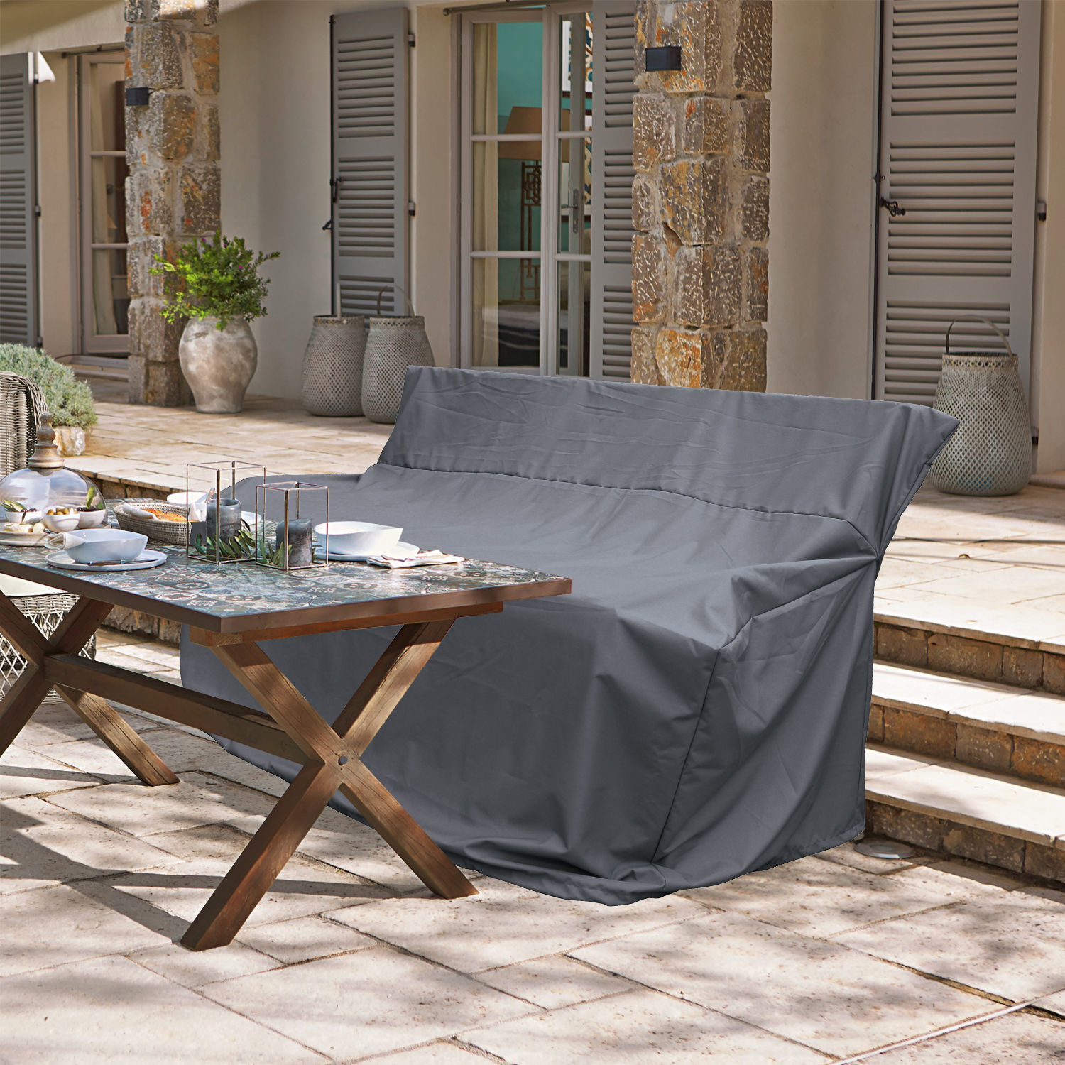 Diese Polyester-Husse ist perfekt auf die Anforderungen zum Schutz von Terrassenmöbeln abgestimmt. Sie hält Wind, Regen oder Schnee von Ihren hochwertigen Sitzmöbeln fern und gibt Ihnen die Gewissheit, dass Sie sich noch Jahre an ihrer Schönheit erfreuen können. Die Anbringung ist wirklich kinderleicht und ein fester Sitz dank eines smarten Zugverschlusses garantiert. Diese Husse ist der perfekte Schutz für die Sitzbank Fenris, die Sie unter der Nummer 13376 bei uns im Onlineshop finden.
