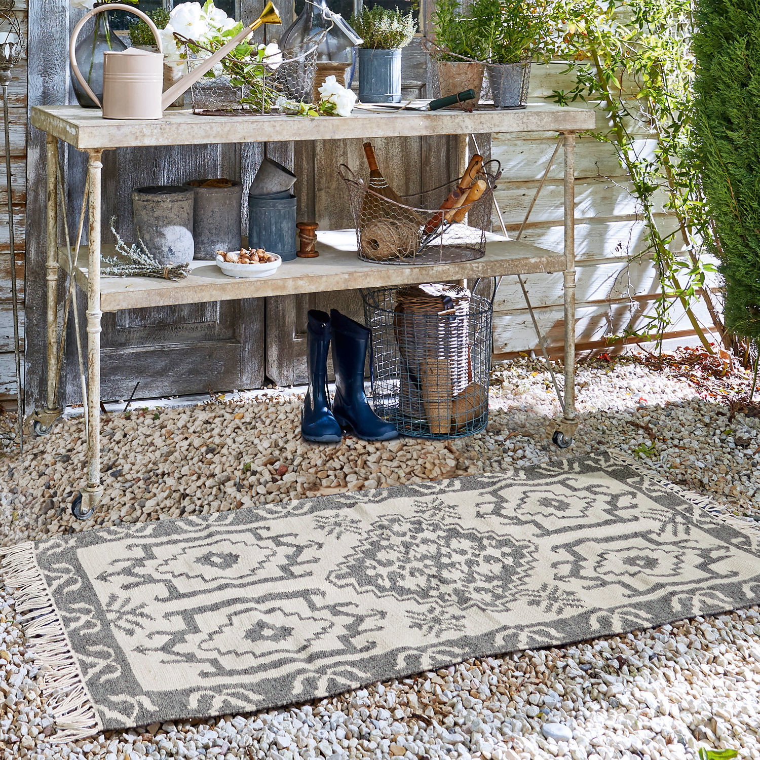 Individuell, stilgerecht, nachhaltig – jeder hat seine ganz eigenen Wünsche vom schönen Wohnen. Dieser Teppich bietet alles, was Sie zum ganz persönlichen Wohngefühl brauchen. Denn seine Herstellung aus gebrauchten PET-Flaschen schont nicht nur wertvolle Ressourcen, sondern macht ihn auch zum perfekten Allrounder für den Innen- und Außenbereich. Die gesammelten Flaschen werden gepresst, geschmolzen, zu Garn versponnen und zu hochwertigen Teppichen wie diesen verwoben. Mit einem farblich reduzierten Ethno-Muster bedruckt, wird er zu einem außergewöhnlichen Hingucker. Dekorative Fransen an den Schmalkanten runden das Bild ab. Durch seine enorm weiche Haptik und edle Optik ist er von einem Baumwollteppich kaum zu unterscheiden. Trotzdem hat er entscheidende Vorteile: Er ist äußerst strapazierfähig, schimmelresistent und behält selbst bei starker Sonneneinstrahlung seine Farbintensität. Durch sein praktisches Format ist das Textil überall einsetzbar – ob in der Diele, in der Küche oder auf der Terrasse. So elegant und behaglich kann Nachhaltigkeit sein.