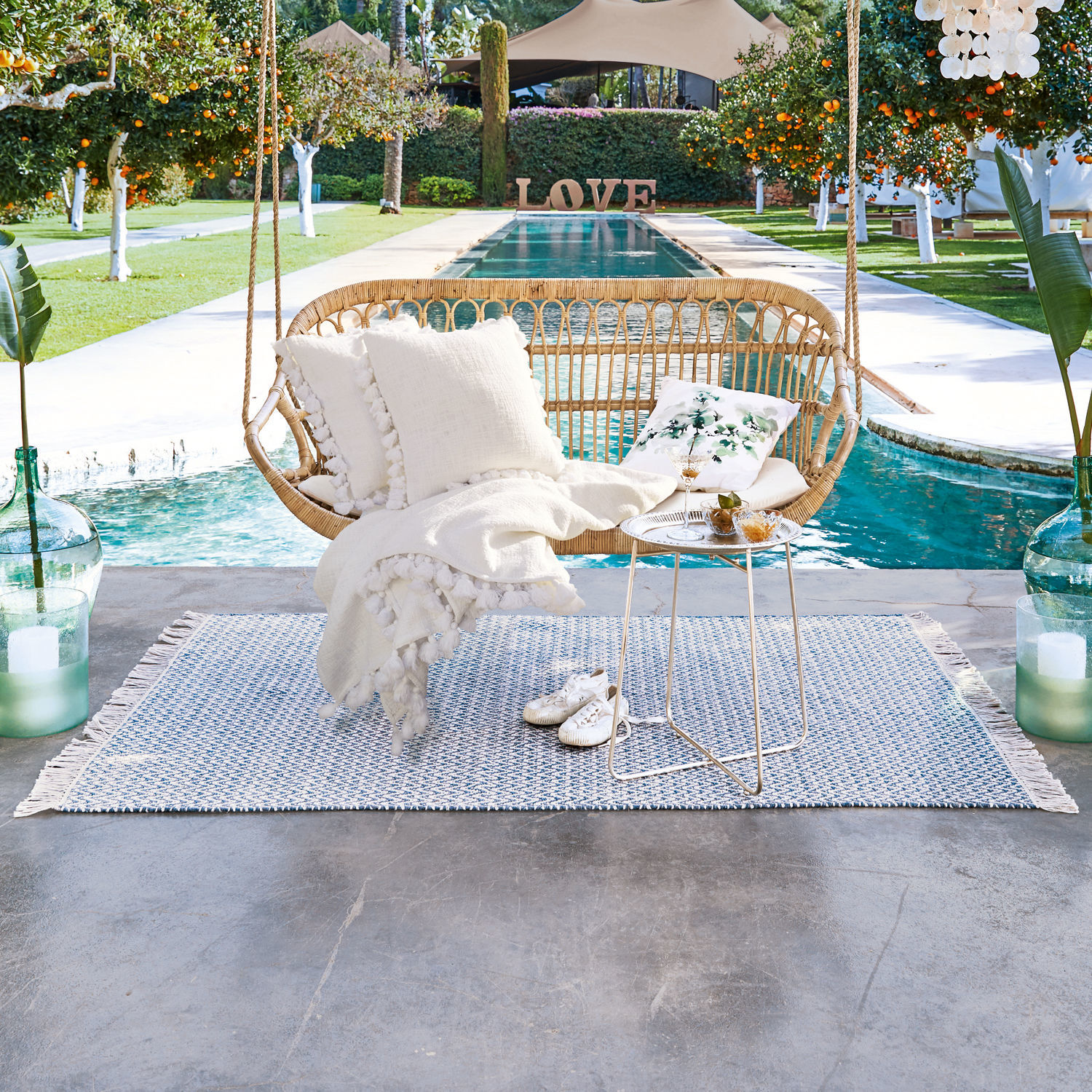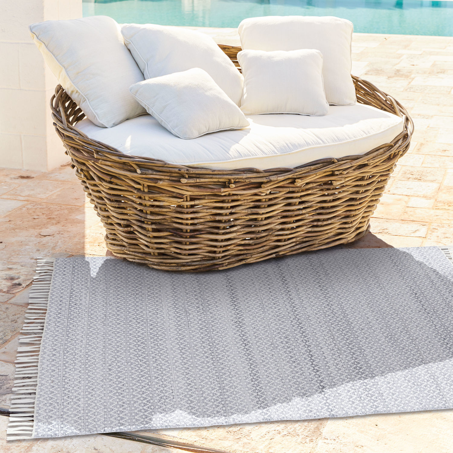Auffällig schöne Muster- und Farbenspiele prägen den viel geliebten Ethno-Look. Er entführt in die Welt fremder Völker und versteht die Kunst, stets einen bleibenden Eindruck zu hinterlassen. Auch mit diesem Teppich im filigranen Rautenmuster haben Sie die Möglichkeit, einen stimmungsvollen Wohnakzent zu setzen. In edler Zweifarbigkeit strahlt er eine moderne Frische und Leichtigkeit aus. Der schmückende Fransenabschluss an den Schmalkanten rundet das Bild gelungen ab. Hergestellt aus wiederaufbereiteten PET-Flaschen setzen sie mit dem Teppich nicht nur ein modisches Statement, sie leisten auch einen aktiven Beitrag zum Thema Umweltschutz. Die gesäuberten PET-Flaschen werden eingeschmolzen und zu strapazierfähigen Garnen verarbeitet. Daraus entsteht ein wunderbarer Allrounder mit überraschend weicher Haptik. Auf grund dieser Eigenschaft kann der Teppich vor allem auch innen verwendet werden. Für den Outdoor-Bereich besitzt er ebenfalls wichtige Eigenschaften: Problemlos hält er Feuchtigkeit, Nässe und der daraus resultierenden Schimmelbildung stand. Was also liegt näher, als den robusten Teppich in viel genutzten Räumen wie Esszimmer, Bad oder Flur einzusetzen. Auch auf Ihrer Terrasse vor der gemütlichen Lounge verbreitet er eine traumhafte Atmosphäre. Zum Shabby-Chic wirkt er besonders schön.