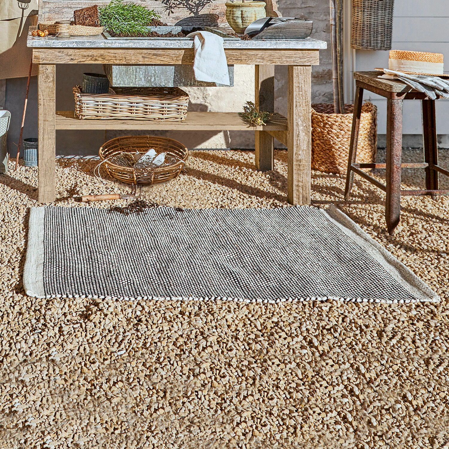 Dieser Teppich setzt nicht nur einen wohnlichen Akzent in Ihrem Interieur, er trifft auch den modernen Zeitgeist. Denn die energie- und ressourcenschonende Herstellung aus wiederaufbereiteten PET-Flaschen ist sein Geheimnis. Sie werden überrascht sein, wie hochwertig und komfortabel das nachhaltige Gewebe ist. Es fühlt sich genauso weich an wie Baumwolle, gleichzeitig ist es widerstandsfähig, wasserabweisend und langlebig. Das macht den Teppich zu einem unkomplizierten Allrounder für drinnen und draußen. Denn er ist perfekt für Räume und Plätze, wo etwas mehr Schmutz und Nässe entstehen kann. So erfreut er nicht nur in Flur, Bad oder Küche mit einer guten Portion Behaglichkeit, sondern auch auf Ihrer Terrasse oder dem Freisitz im Garten. Durch sein effektvolles Webdesign in klassischer Zweifarbigkeit passt er sich nahezu jedem Stil an. Ein inspirierendes Beispiel, wie vielseitig nachhaltiger Wohnluxus sein kann.