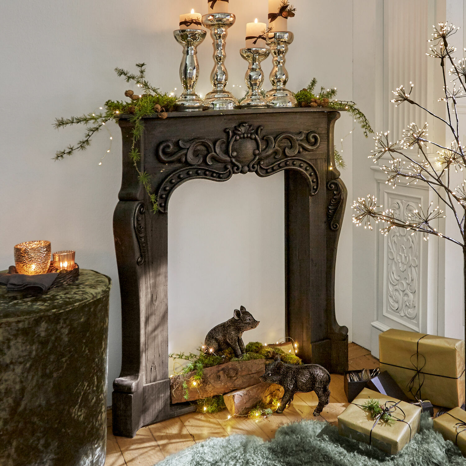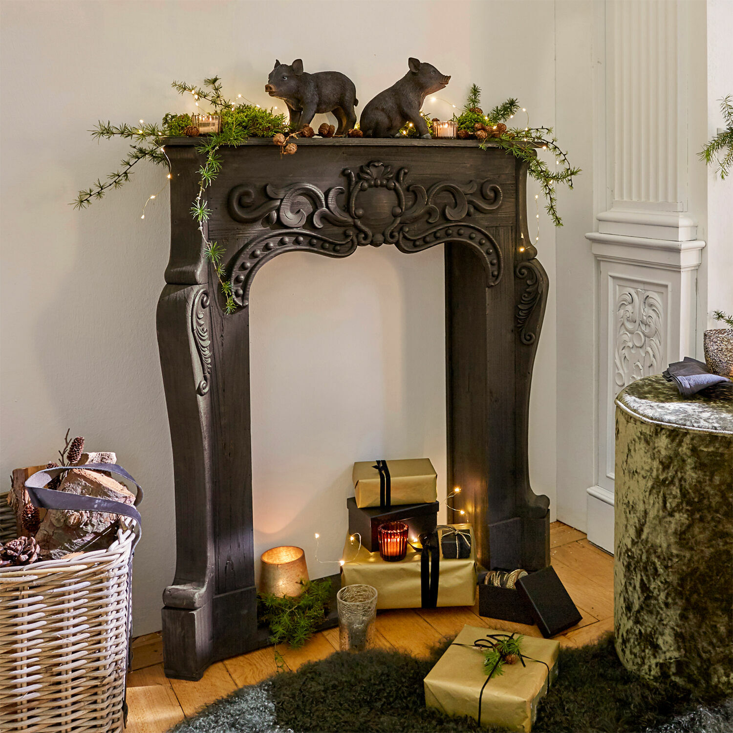 Die in Handarbeit gefertigte Eckkonstruktion aus lasiertem Tannenholz, die auch gerade an eine Wand gestellt werden kann, wurde in liebevoller Kleinarbeit mit verspielten Ornamenten aus Polyresin geschmückt. Das Ergebnis ist eine Konsole im Antiklook, die wirkt wie aus einem Stück geschnitzt. Für gemütliche Stunden und besinnliche Momente arrangieren Sie – eigerahmt von der hübschen Kaminkonsole – ein paar unterschiedlich große Stumpenkerzen und einige silberfarbene Leuchter auf einem Tablett aus Aluguss.