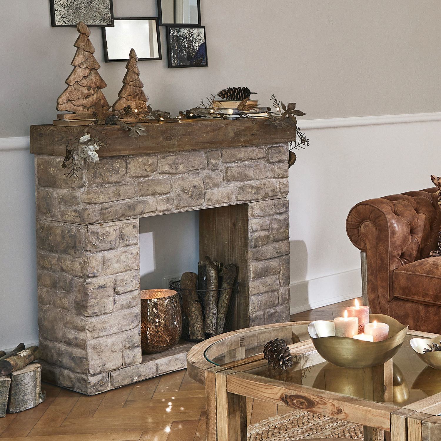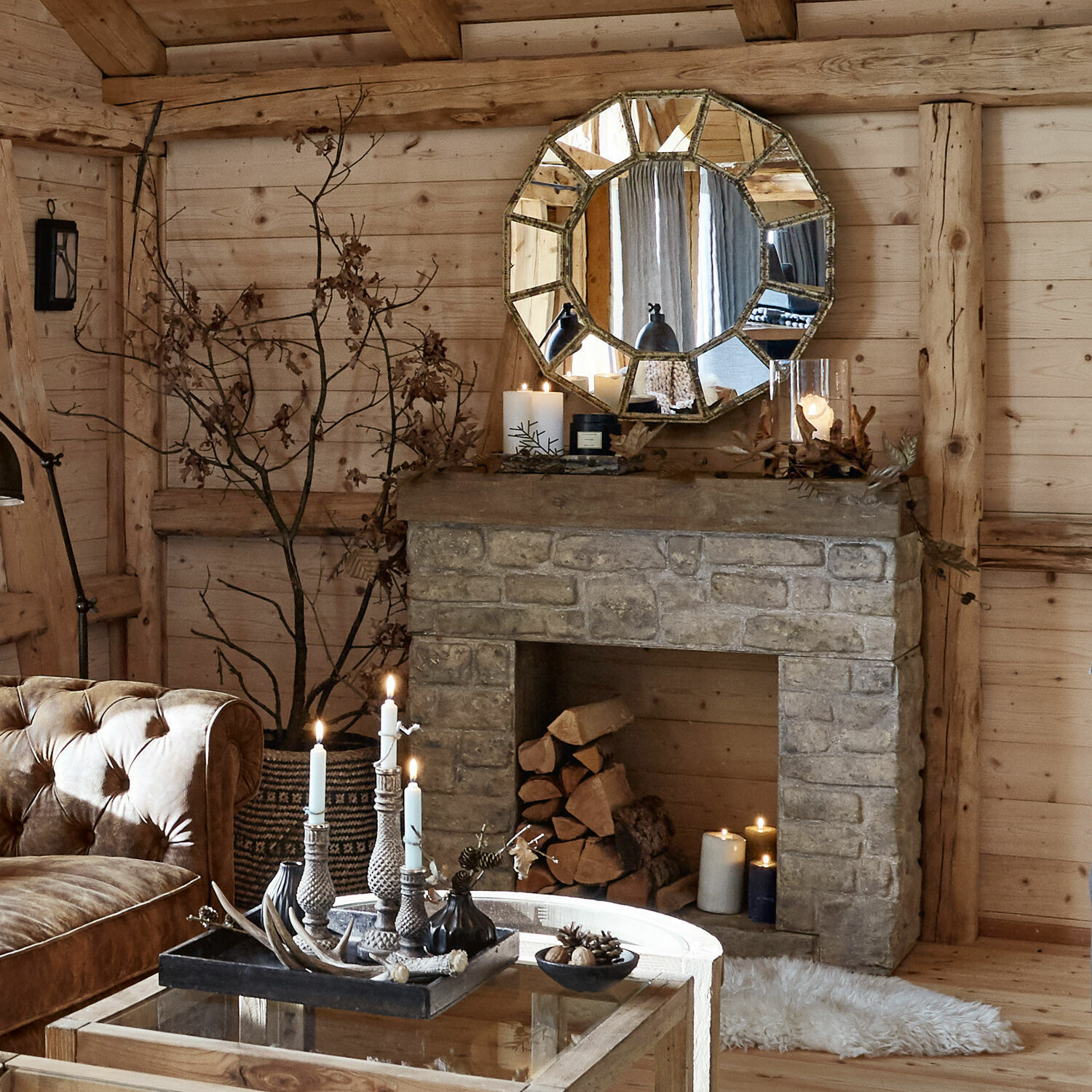 Wollte man es sich früher in der kalten Jahreszeit zu Hause gemütlich machen, entzündete man ein prasselndes Feuer im Kamin. An das alle nah heranrückten, um sich zu wärmen und dem lebendigen Spiel der Flammen zuzuschauen, während man entspannt plauderte, ein Buch las oder sich einer Handarbeit widmete. Die Raumluft auf angenehme Temperaturen zu bringen, ist heutzutage nicht mehr schwierig, oft fehlt unseren Wohnräumen aber dieses gewisse Etwas, das die gemütliche Atmosphäre perfekt macht. Haben Sie schon einmal daran gedacht, dass das fehlende Element eine Kaminkonsole sein könnte? In der nicht einmal ein echtes Holzfeuer brennen muss, um anheimelnde Stimmung zu verbreiten. Oft reichen ein paar dicke Stumpenkerzen im Inneren und erlesene Deko-Objekte auf dem Kaminsims, damit dieses besondere Flair von Behaglichkeit entsteht. Diese Kaminkonsole ist im Stil der klassischen Vorbilder gefertigt, die früher aus den gleichen Natursteinen gemauert wurden wie die Landhäuser selbst. Neben der rustikalen Steinwand-Optik bildet der massive Holzbalken den stiltypischen Abschluss, der bei dieser Kaminkonsole aber aus wiederaufbereitetem Kiefernholz besteht und mit seiner individuellen Note jede Kaminkonsole zu einem Unikat macht. Ein Raum-Accessoire, das rustikales Flair mit einer anheimelnd nostalgischen Note verbindet.