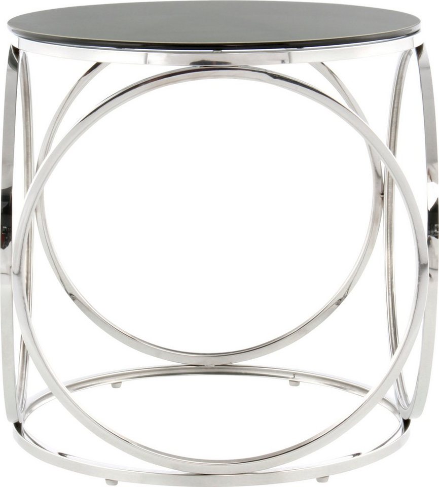 Das moderne Design des eleganten Beistelltischs »Whitney 225« von Kayoom schafft einen Blickfang in deinem Wohn-/Essbereich. Das ringförmig angeordnete Gestell besticht durch seine offene Gestaltung, die es filigran erscheinen lässt. Es ist aus Edelstahl im edlen Hochglanz-Finish gefertigt. Perfekt auf die elegante Optik abgestimmt ist die runde Tischplatte aus geschliffenem Sicherheitsglas. Sie liegt rahmenlos und schwebend auf. Das Beistellmöbel kannst du vielseitig zu Sofa oder Sessel arrangieren oder als dekoratives Einzelteil nutzen. Es eignet sich im Weiteren zur Platzierung von Dekoelementen wie Bilderrahmen, Pflanzen oder Tischleuchten. Für den alltäglichen Einsatz bietet dir das hochwertig verarbeitete Kleinmöbel pflegeleichte Oberflächen. Überzeugt durch Stabilität und Optik: der elegante Beistelltisch »Whitney 225« im modernen Design aus der Kollektion von Kayoom.