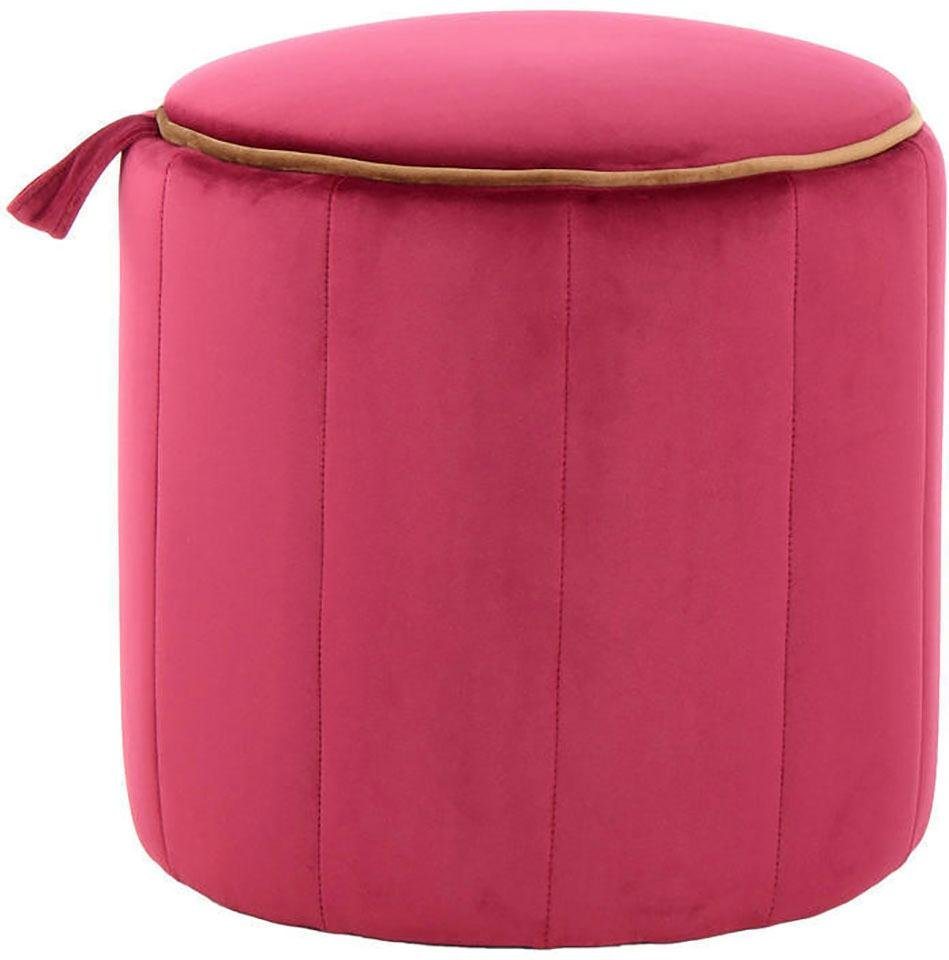 Der dekorative Hocker »Reese« aus dem Hause Kayoom beeindruckt mit einem trendigen Erscheinungsbild. Er besitzt eine zylinderförmige Gestalt, die durch vertikale Steppnähte an den Außenseiten betont ist. Sehr apart wirkt der optisch abgesetzte Rand mit einem farblich kontrastierenden Keder. Eine Griffschlaufe an der Seite unterstützt eine leichte Handhabung, mit welcher sich der Polsterhocker bewegen lässt. Seine samtweiche, textile Oberfläche verleiht dem Möbel einen bequemen Eindruck. Es lässt sich als Ergänzung der Sitzgelegenheiten im Wohn- oder Schlafzimmer sowie in anderen Räumen nutzen. Mit dem dekorativen Hocker »Reese« aus dem Hause Kayoom erhält jede Einrichtung eine stilvolle Bereicherung.