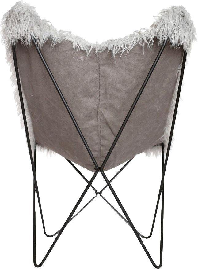 Der gemütliche Schmetterling Stuhl »Lynn« aus dem Hause Kayoom überzeugt mit einem extravaganten Erscheinungsbild. Seine Sitzfläche ist mit einem weichen Bezug aus flauschigem Kunstfell bezogen, das ihm einen komfortablen und rustikalen Look verleiht. Dazu bildet das filigrane Untergestell einen aparten Kontrast, welcher modern wirkt. Das Kunstfell besteht aus Textilien. Für die Anfertigung des Gestells verwendet der Hersteller Metall. Stühle dieser Art eignen sich optimal für die Gestaltung einer Leseecke, eines Entspannungsraumes oder als Ergänzung zu einer Polsterecke im Wohnzimmer. Mit dem gemütlichen Schmetterling Stuhl »Lynn« aus dem Hause Kayoom erhält jede Einrichtung einen interessanten Blickfang.