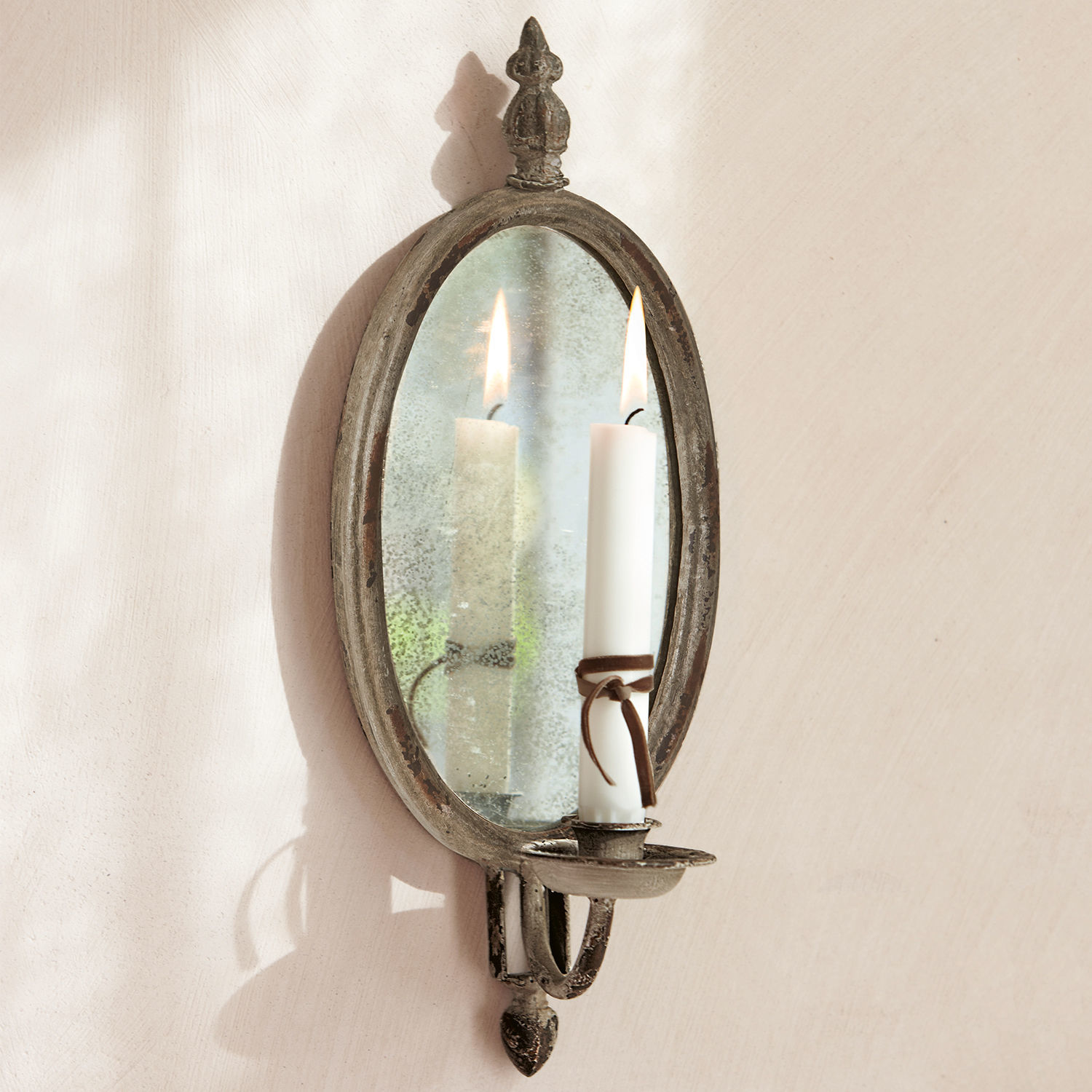 Wunderschön reflektiert wird das Licht einer Kerze mit diesem Kerzenhalter im Antik-Look. Der Kerzenhalter in Form eines Medaillons wird an die Wand angebracht. Der Rahmen aus Eisen besticht mit seinem antiken Charme und auch das Spiegelglas wirkt leicht angelaufen. Die tropfenförmigen Verzierungen am Rahmen verleihen dem Wandkerzenhalter seinen individuellen Look. Die Halterung für eine Stabkerze ist bogenförmig mit dem Eisenrahmen verbunden. Praktisch: Der Kerzenteller fängt tropfendes Wachs auf. Dank der originellen Verarbeitung ist dieses besondere Stück aber auch ohne leuchtende Kerze ein schöner Hingucker.