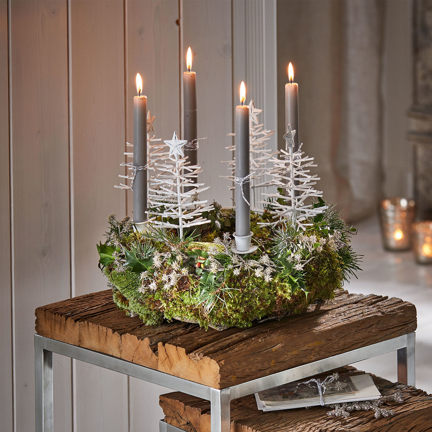 Ein kleines Kunstwerk aus Eisen mit mattem Antik-Finish. Vier Tafelkerzen lassen sich hierin wunderhübsch illuminieren. Wer mag, kann den Kerzenhalter im skandinavischen Stil auch als Alternativ zum grünen Adventskranz nutzen und nur jeden Adventssonntag eine Kerze anzünden. Die Details sind liebevoll herausgearbeitet. So zieren etwa knuffige Sterne die verschneiten Tannenwipfel. Holen Sie sich das Winter Wonderland wie im hohen Norden einfach in die heimische Stube und genießen Sie den stilvollen dekorativen Effekt sowie heimeligen Kerzenschein. Wer denkt da nicht gleich an einen Spaziergang durch den verschneiten Winterwald?