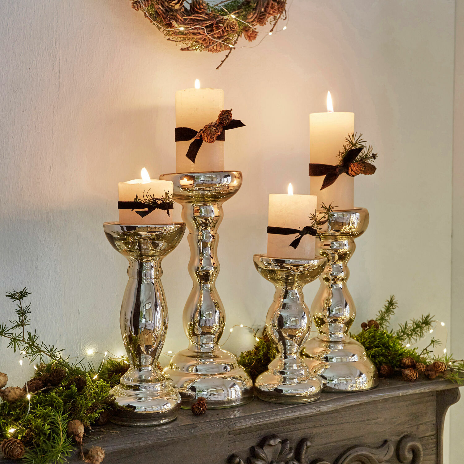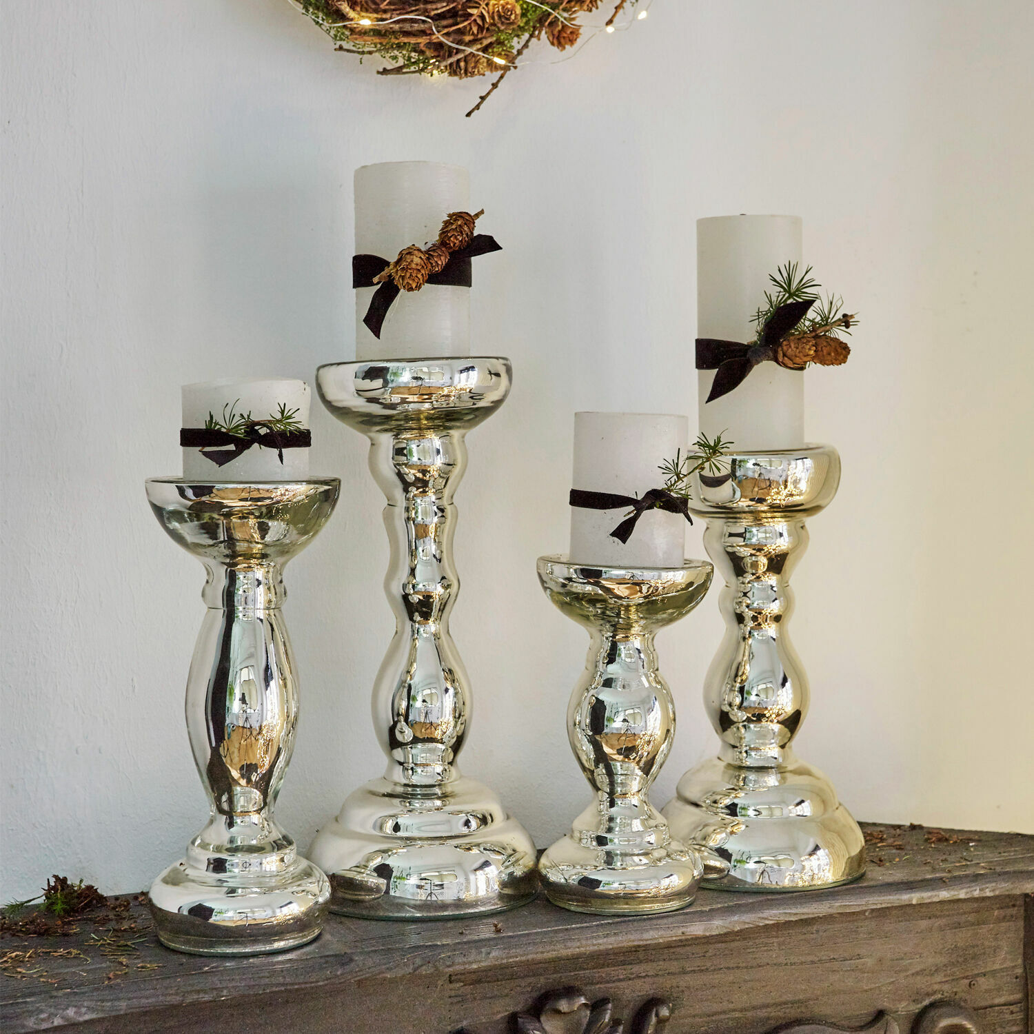 Dieses vierteilige Set ist besonders spannend, weil die Kerzenständer zwar klassisch geformt sind, aber durch ihren schillernden Silber-Look vollkommen zeitlos wirken. Die spiegelnde Oberfläche verleiht jedem Kerzenständer eine besondere Tiefe und Dimension. Im Kerzenschein wird dieser Eindruck noch intensiviert. Sie sind mit einem wunderschönen Bauernsilber-Finish versehen, was sie nur noch mehr adelt. Sie sind ideal für handelsübliche Stumpenkerzen geeignet. Hier können Sie die Farbe Ihrer Wahl kombinieren, denn zu Silber passt einfach jede Farbe. Alle vier Kerzenständer sind unterschiedlich groß und verzaubern jede Anrichte und jeden Tisch. Ob in der Gruppe oder einzeln aufgestellt, bringen Sie Glanz in Ihr Zuhause. Ergänzen Sie die Accessoires noch mit saisonaler Deko und kreieren Sie so eine stilvolle Dekoration das ganze Jahr hindurch.