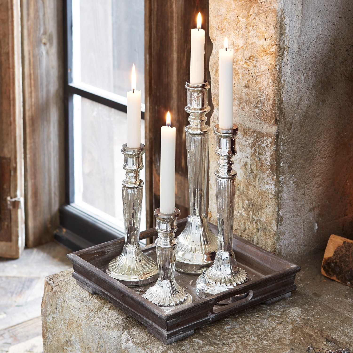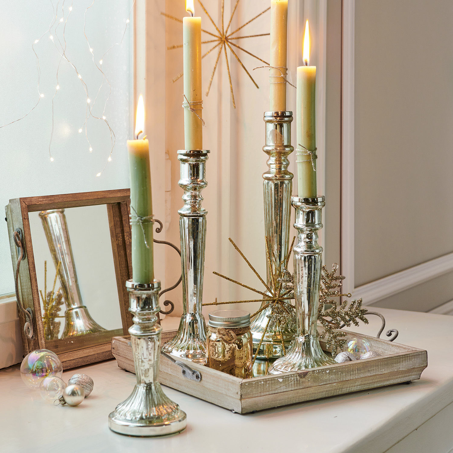 Dieses wunderschöne Kerzenständer 4er Set verzaubert die Festtage. Vier Kerzenständer im Vintage-Stil, die nach Bauernsilber-Art verspiegelt sind, fangen das warme Kerzenlicht ein und reflektieren es. Für jeden Tag des Advents können sie hier eine Kerze anzünden. Wer nicht so lange warten mag, illuminiert einfach alle vier Leuchter bereits vorab. Dieses bezaubernde Set eignet sich ideal für individuelle Advents-Arrangements. Genießen Sie die schlanke, elegante Form der Kerzenhalter pur, oder schmücken Sie sie mit weihnachtlicher Dekoration. Die Kerzenständer aus Glas und Metall eignen sich für feine Tafelkerzen. Kunstvoll gearbeitete Details machen den Charme dieses 4er Sets aus. Alle vier Kerzenständer haben unterschiedliche Höhen, so dass ein reizvolles Bild entsteht. Sie können sie immer wieder neu arrangieren und auf Wunsch auch einzeln in der Wohnung verteilen – ob auf dem weihnachtlichen Tisch, Ihrem Nachttisch, auf einer Anrichte oder einer Kommode. Jeder Raum gewinnt an Gemütlichkeit, wenn er in weiches Kerzenlicht getaucht wird. Unser Tipp: Zu einem romantischen Candlelight Dinner oder auch zum Weihnachtskaffee mit den Liebsten ist dieses Set einfach der perfekte Begleiter. Erst eins, dann zwei, dann drei, dann vier, schon steht die Weihnacht vor Ihrer Tür. Und auch nach den Festtagen sind diese edlen Leuchter eine echte Zierde in jedem Heim.