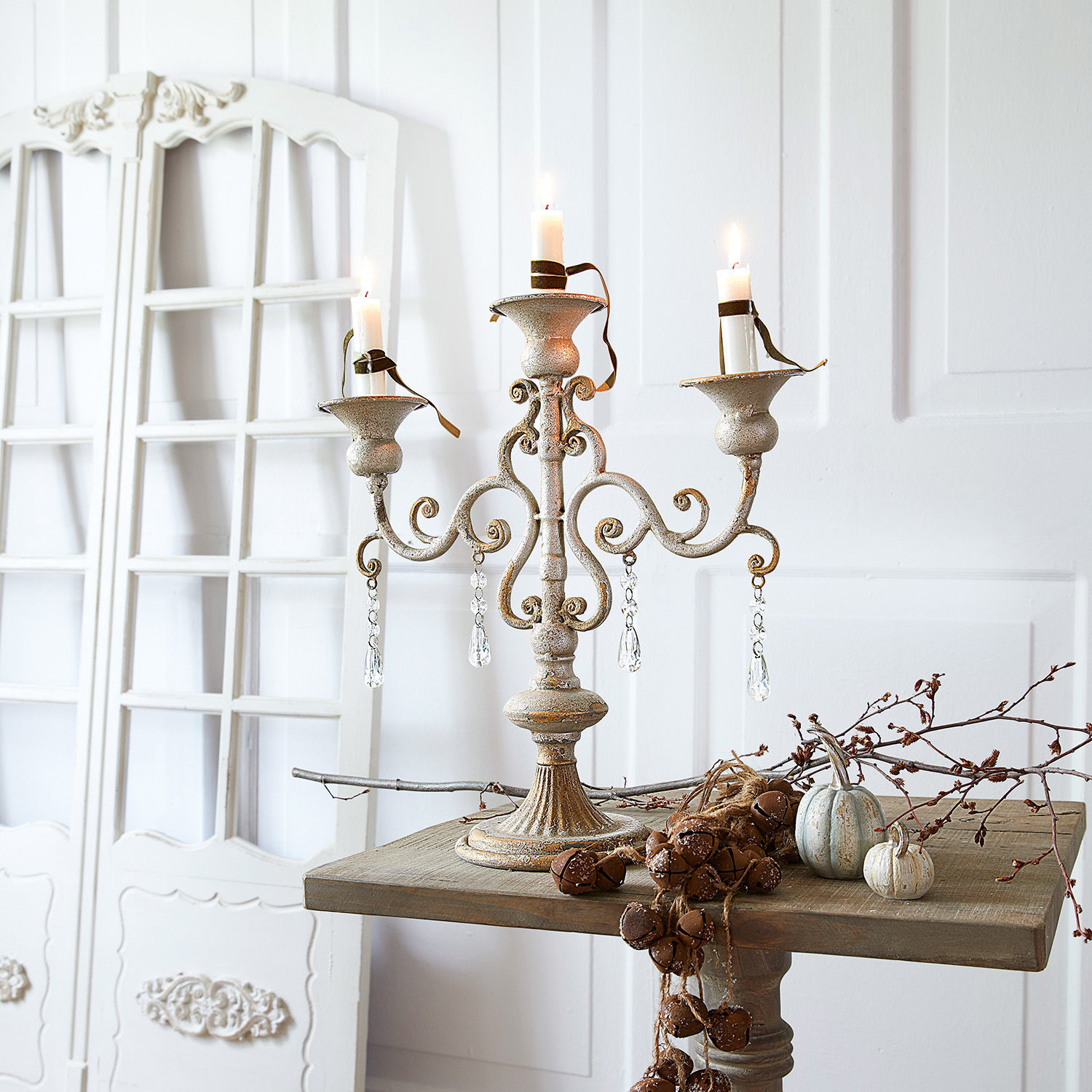 Ein wahres Prachtstück voll romantischem Vintage-Zauber. Der edle, recht große Kerzenhalter besteht aus Eisen mit Antik-Finish. Er ist mit glamourösen Glas-Prismen geschmückt, die für eine Extraportion Flair sorgen. Sie funkeln reizvoll, sobald sich das Licht in ihnen bricht. Das elegante Design hat eine sehr authentische, nostalgische Note und könnte direkt aus einem verwunschenen Schloss stammen oder ein seltener Dachboden-Fund sein. Kunstvoll verziert und filigran – ein Meisterwerk für ein romantisches Zuhause. Bestücken Sie ihn den Kerzenständer mit drei Stabkerzen und erleben Sie gemütliche Momente bei warmem Kerzenschein. Ein wunderbarer Schmuck für den Tisch oder eine Kommode – ein Accessoire, welches ganz leicht für einen Hauch Luxus in jedem Raum sorgt.