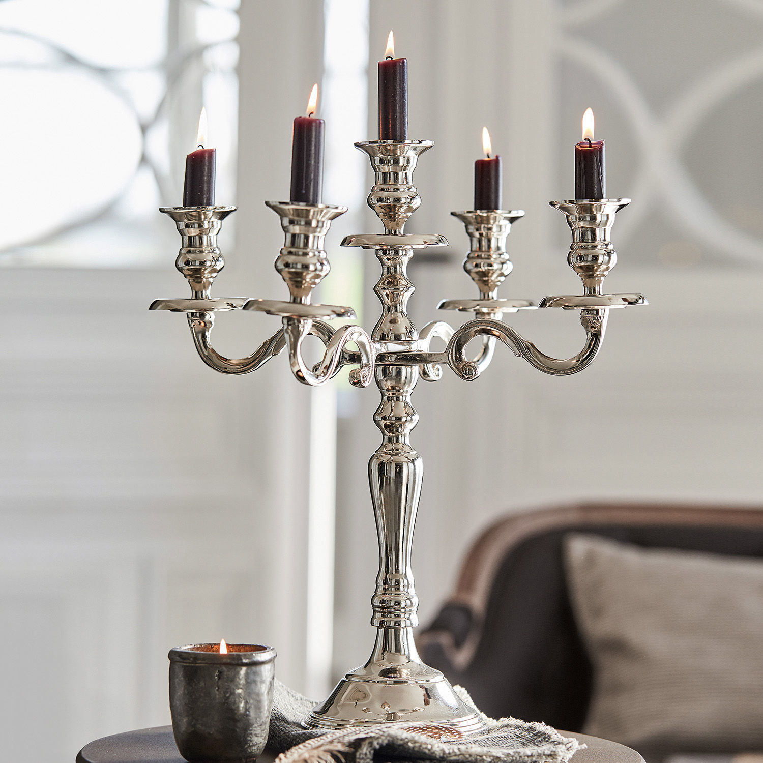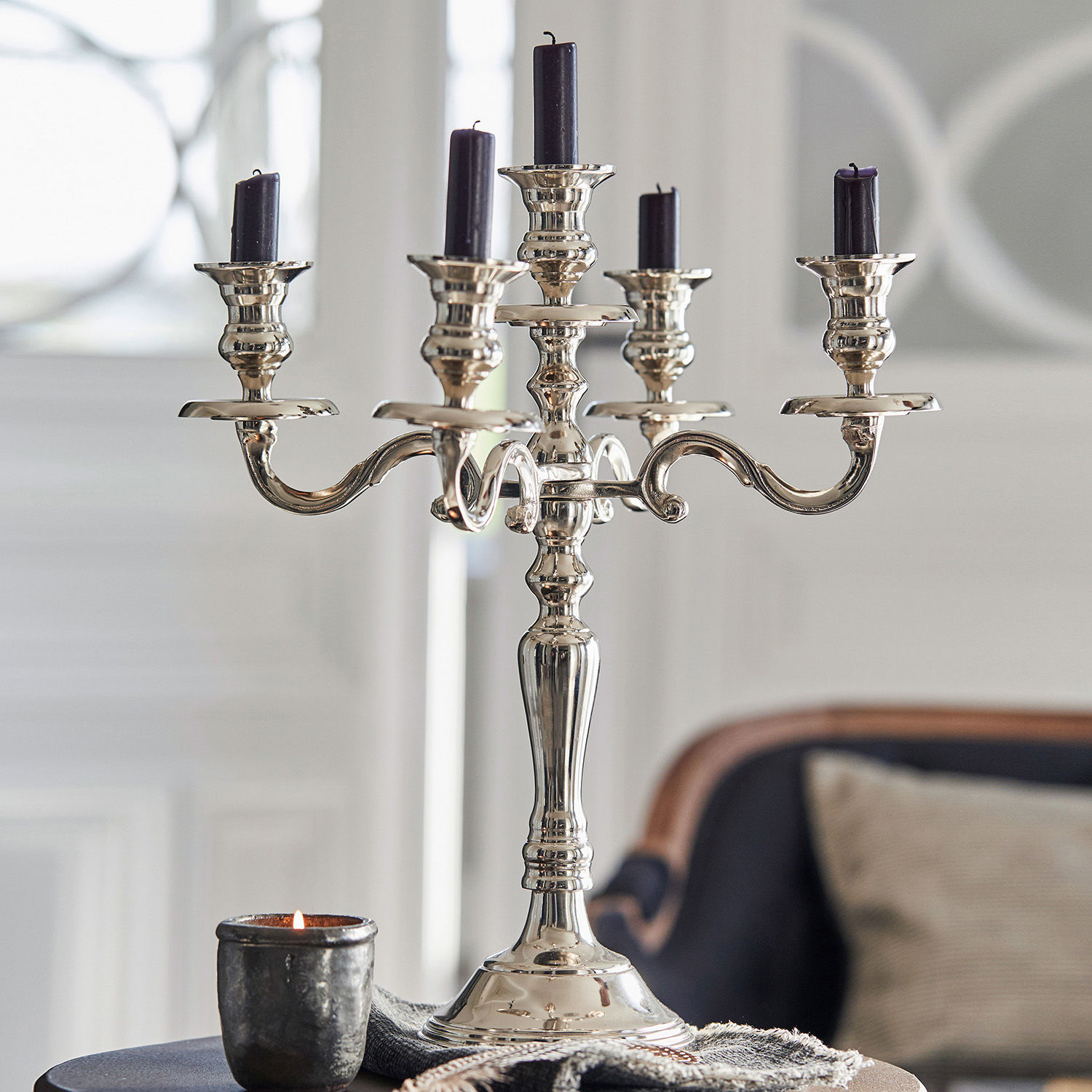 Es gibt Accessoires, die einfach immer perfekt sind. Genau wie dieser Kandelaber im zeitlos schönen Design. Das silbrig glänzende Aluminium verbreitet festliche Stimmung. Diese wird noch feierlicher, sobald die Kerzen angezündet sind und den Raum erhellen. Ingesamt können fünf Stabkerzen in den Halterungen platziert werden. So ist am Abend für perfektes Licht gesorgt. Ob beim romantischen Pärchenabend oder beim Essen mit Freunden und Familie – dieser Blickfang wird ganz bestimmt oft zum Einsatz kommen. Eine gute Figur macht der Kerzenhalter ebenfalls überall. Auf dem Esstisch, auf einer Kaminkonsole oder auf einer Kommode – wo auch immer Sie das prachtvolle Stück platzieren, erhält das Ambiente eine ganz besondere Atmosphäre. Ein Hauch von Luxus und savoir-vivre schwingt hier nicht zu übersehen mit. Das elegante Design passt wunderbar zu jedem Einrichtungsstil. Dieses Multitalent passt sich ganz charmant seiner Umgebung an und schmückt diese mit seinem wunderschönen Anblick. Bei Bedarf kann er auseinander geschraubt werden. Ideal für die gründliche Reinigung, den Umzug oder einfach für platzsparendes Verstauen des Eyecatchers.