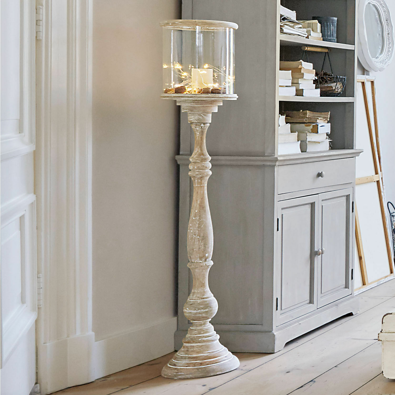 Ein Windlicht für Liebhaber eines stilvollen Auftritts und mit buchstäblich hohen Ansprüchen: Denn dieses Schmuckstück besticht durch sein großes Format. Hier verbindet sich kunstvolles Design mit einem sehr fein bearbeiteten Mangoholz, das mit einem White-Washed-Finish veredelt wurde. Das kunstvolle Deko-Objekt für schöne Lichtmomente verfügt über eine edle Glasfassung. Windböen haben dadurch keine Chance, die Kerze im Inneren wird unbeeindruckt weiterbrennen. Aber natürlich ist das Windlicht nicht nur für draußen auf Balkon oder Terrasse geeignet – es verwöhnt Sie auch in jedem Innenraum Ihrer vier Wände mit wunderbar flackerndem Kerzenlicht. Bei der Wahl der Kerzen für die dafür vorgesehene Halterung können Sie selbst kreativ werden, denn diese werden nicht mitgeliefert.