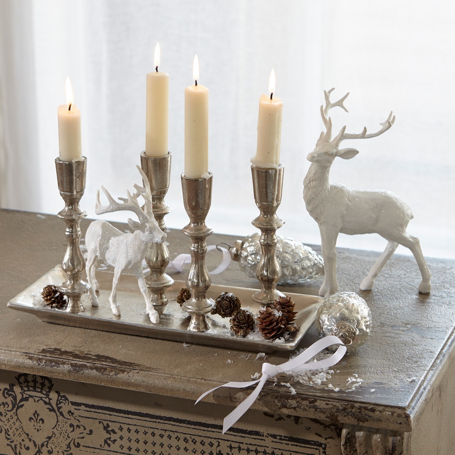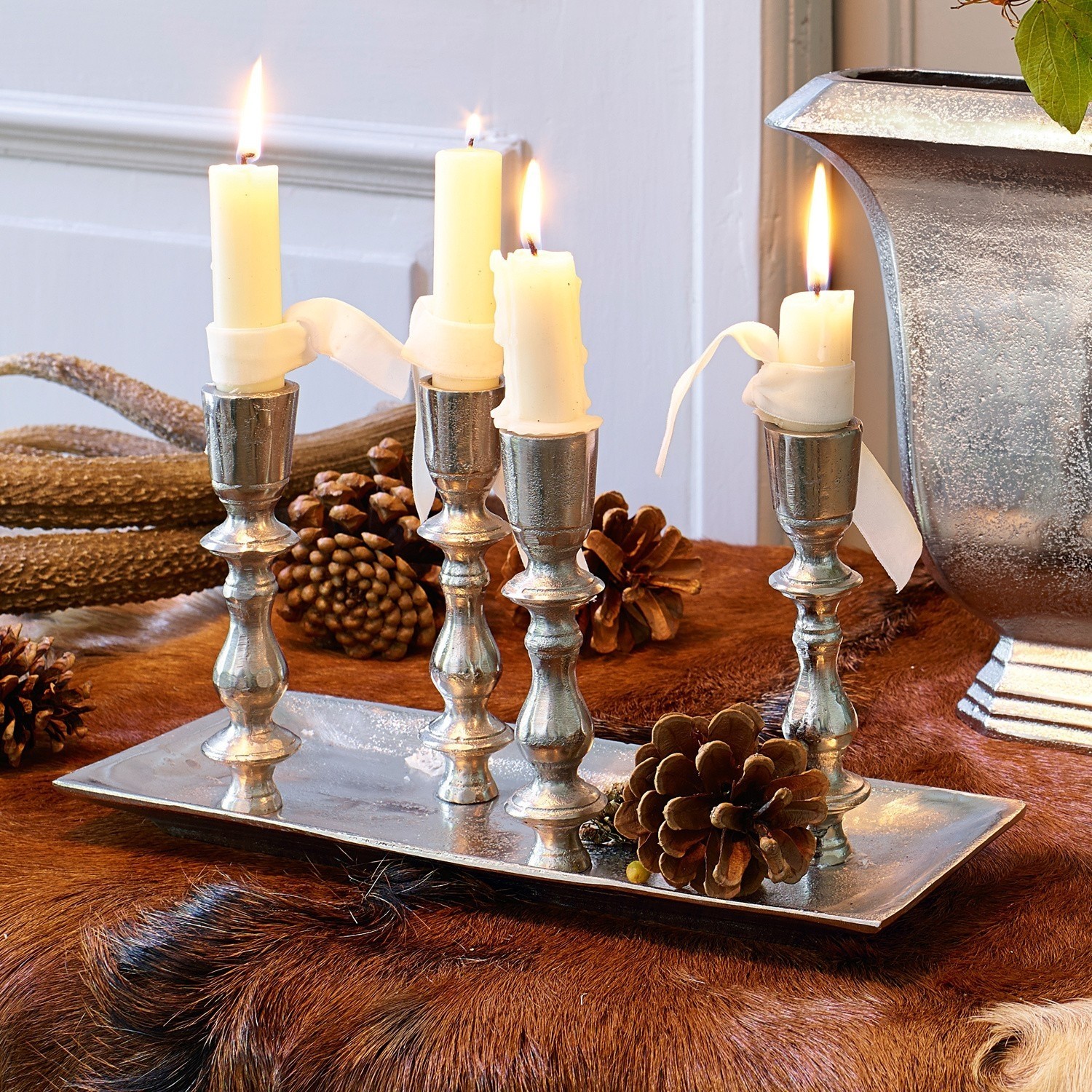 Dieses Kerzentablett ist besonders hübsch anzusehen und auch sehr funktionell. Die vier kunstvollen Kerzenhalter lassen sich abschrauben und ganz nach Wunsch anordnen. Genau wie das Tablett selbst, bestehen diese aus reinem Aluminium und entfalten unter dem Schein der Kerzen ihren vollen Glanz.