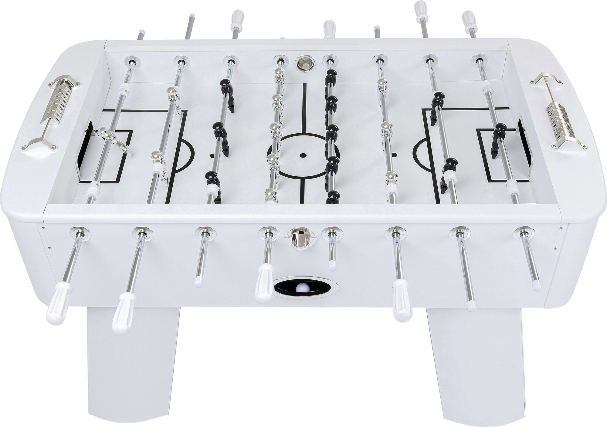 Weltmeister, was den coolen Style angeht, ist dieser schwarz-weiße Kickertisch auf jeden Fall schon mal. Ob zum Training für das nächste Kneipen-Turnier oder beim Kampf um den Titel in den eigenen vier Wänden, dieser KARE Kicker steht eindeutig an der Tabellenspitze. Material: (Stahl verchromt Spieler, Spanplatte kunststoffbeschichtet E1 beschichtet (Spielfeld), Edelstahl verchromt Stangen, Gestell: mitteldichte Faserplatte kunststoffbeschichtet)