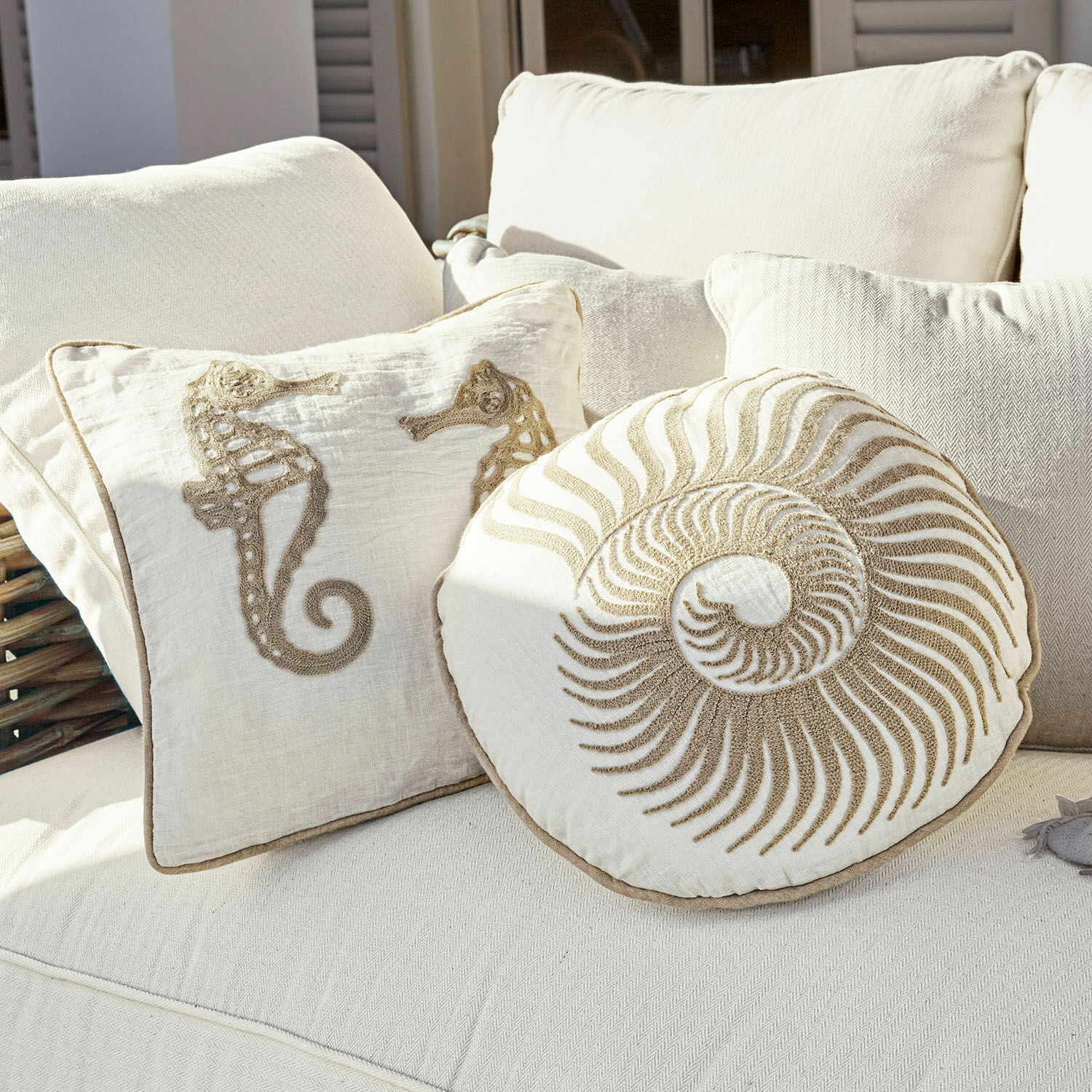 Nichts bringt das weite Meer so nah wie der Küsten-Look. Und mit den richtigen Wohntextilien und Accessoires bringen sie das Feeling auch in Ihr Zuhause. Da darf dieses außergewöhnliche Kissen-Set nicht fehlen, das bestimmt zum gemütlichen Dauergast auf Ihrem Sofa oder der Terrassenlounge wird. Die schönsten Schätze des Meeres standen Pate für die aufwendig von Hand bestickten Motive: So ist das eine Kissen mit hübschen Seepferdchen verziert, während sich das andere in runder Formgebung und origineller Muschel-Optik zeigt. Als Basis dient ein natürliches Leinengewebe, das mit seiner charaktervollen Struktur die edle Ausstrahlung unterstreicht. Dazu gehört auch der kontrastfarbene Keder-Rand, der nicht nur dekorativ ist, sondern auch für mehr Formstabilität sorgt. Durch einen Reißverschluss lassen sich die Bezüge problemlos abziehen und separat in der Maschine waschen.