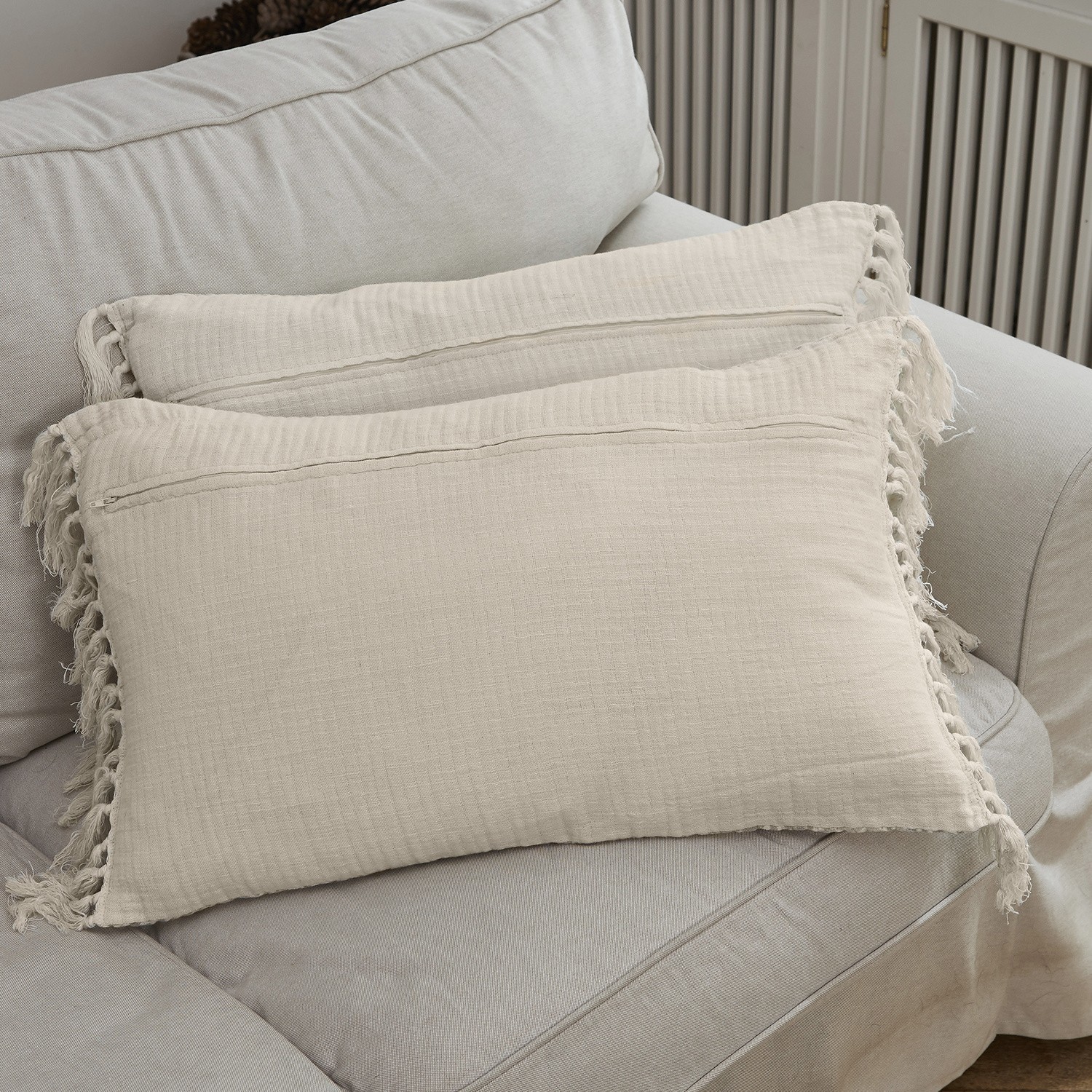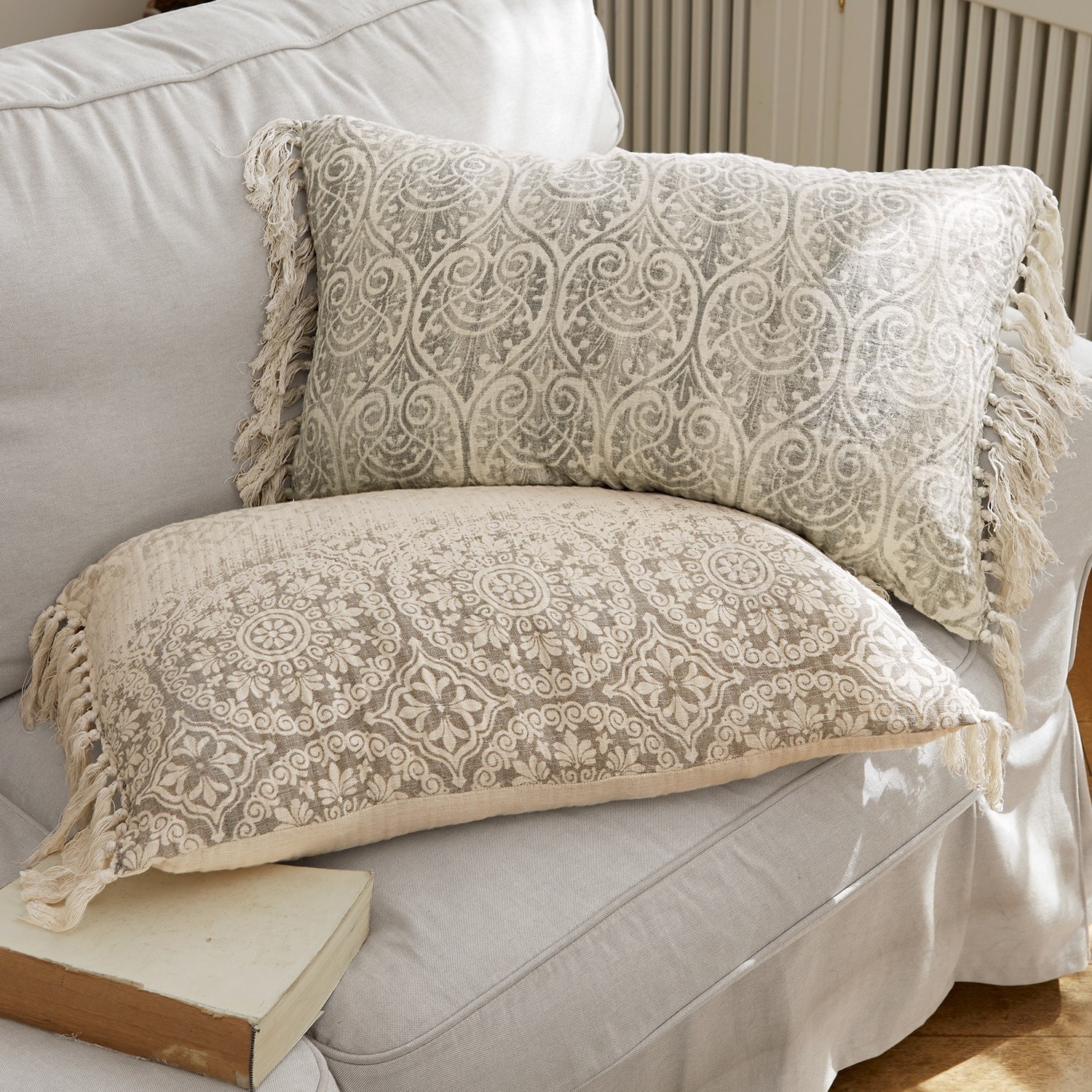 Exquisite Prints im Bohème-Stil und beidseitigem Fransenabschluss. Orientalische Ornamente verleihen den zwei Baumwollkissen ihre edle Wirkung. In natürlichen Tönen […]