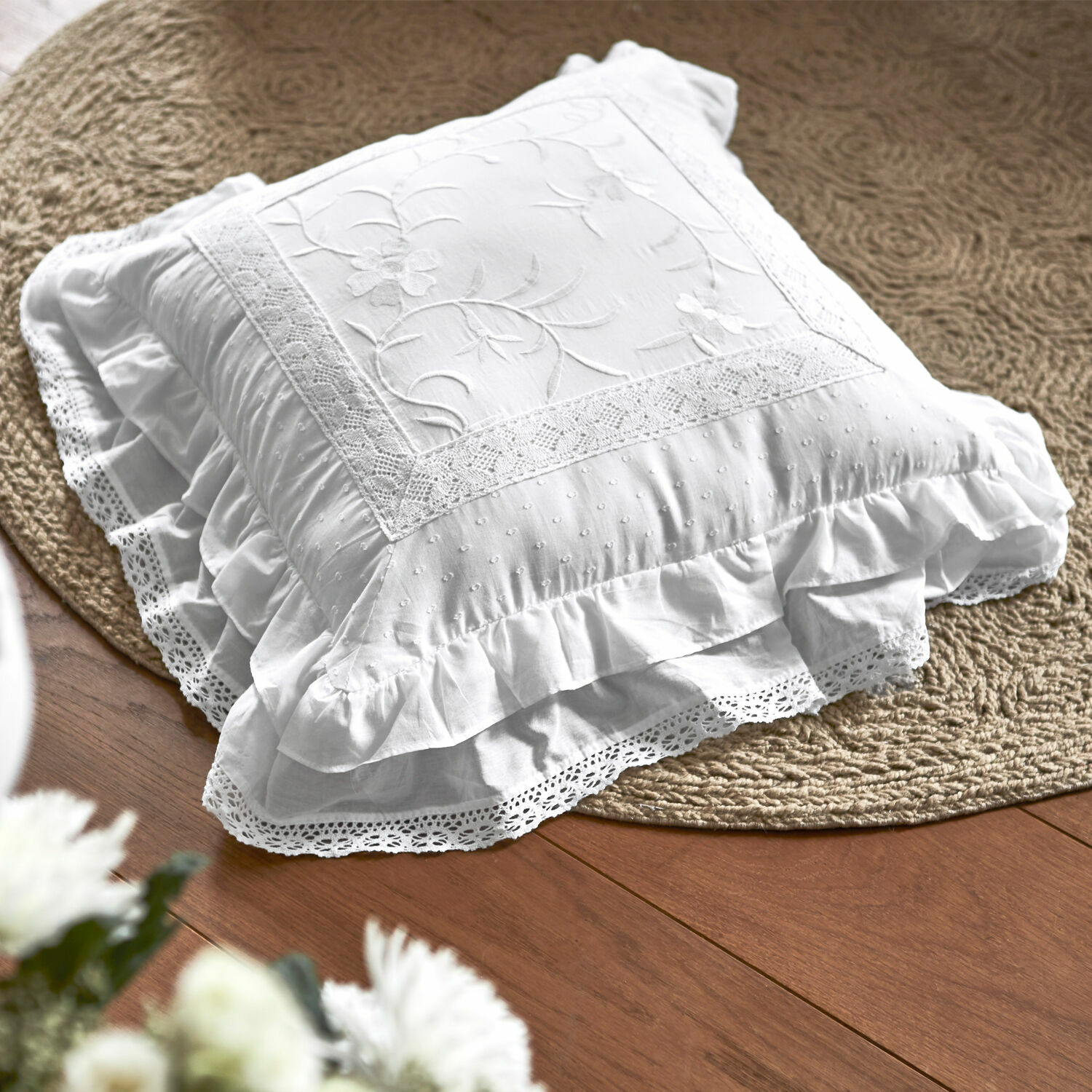 Dieses entzückende Kissen verströmt eine ganz besondere Romantik. Florale Stickereien, fein gehäkelte Details und eine gewellte Borte unterstreichen den klassischen Vintage-Charme. Die luftig gewebte Baumwolle fühlt sich einfach herrlich auf der Haut an. Auf der Rückseite befindet sich der diskrete Reißverschluss, der die Entnahme der formstabilen Füllung ermöglicht.