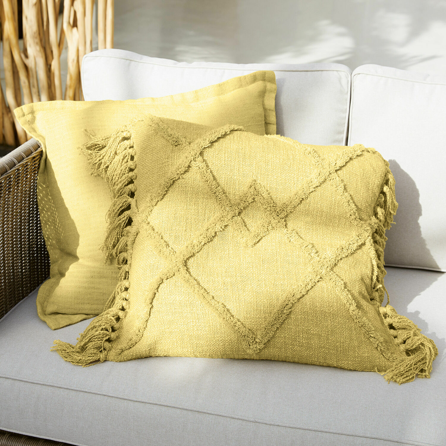 Holen Sie sich einen Hauch Boho-Charme und ein sehr reizvolles Doppel nach Hause – diese beiden hübschen Kissenhüllen sind eine Augenweide. Sie bestehen aus reiner Baumwolle und sind angenehm weich in der Haptik. Sie erhalten zwei Designs im Set, die bestens miteinander harmonieren. Eines ist mit getufteteten Rauten und langen Fransen verziert, das andere mit einem kleinen Fransenrahmen. Füllkissen (exklusiv) können Sie frei dazu wählen, und dank des Reißverschlusses ist das Beziehen sehr einfach. Beim Entspannen auf der Couch, auf der Gartenliege oder im Bett wird es hiermit gleich noch schöner, und viele Wohnstile freuen sich über den reizvollen Deko-Akzent.