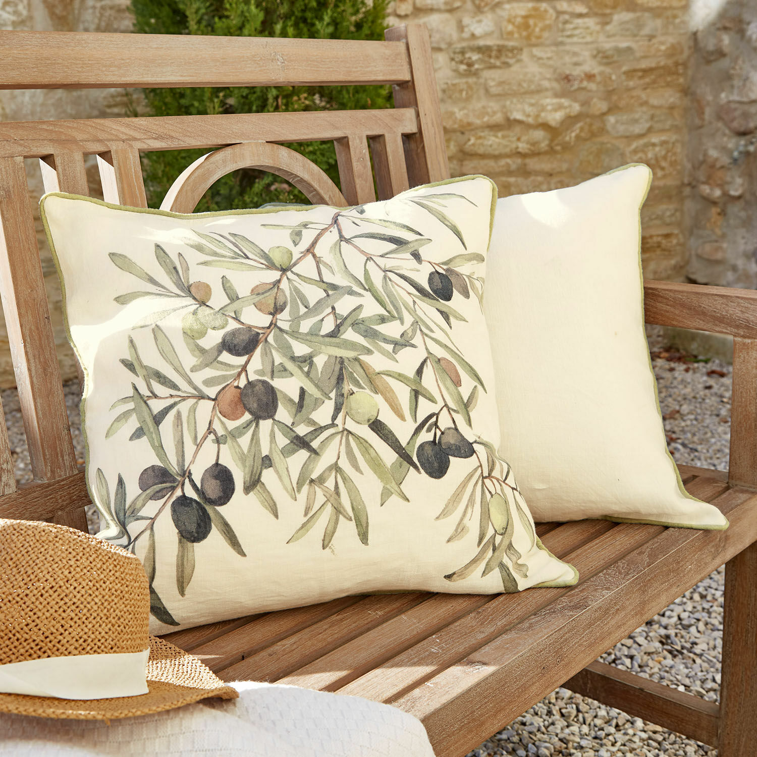 Holen Sie sich den Urlaub einfach nach Hause – diese beiden hübschen Kissenhüllen haben charmantes, mediterranes Flair. Sie sind mit einem farbigen Keder und einem reizenden Oliven-Motiv geschmückt und bestehen aus reinem Leinen. Diese beiden Designs harmonieren perfekt miteinander und bieten zusammen ein besonders schönes Esamble. Beide sind waschbar und haben einen Reißverschluss zum ganz einfachen Beziehen. Machen Sie hiermit ganz normale Kissen (exklusive) zu wahren Deko-Highlights. Genießen Sie diese frischen Farben und den wunderschönen, natürlichen Print auf dem Sofa, einem Sessel oder auf einer Lounge auf dem Balkon. Machen Sie es sich gemütlich, denn die stilvollen Designs schmeicheln vielen Interieurs und sind sehr zeitlos.