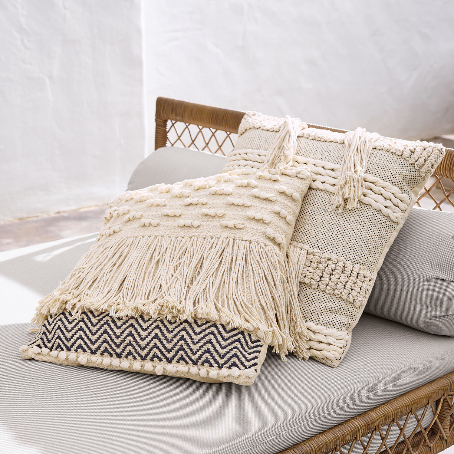 Makramee war schon in den 70igern ein beliebter Dekotrend, heute lebt die dekorative Knüpftechnik wieder auf und avanciert Wohnaccessoires zu echten Lieblingsstücken mit Boho-Charme. Dazu zählen auch diese beiden Kissenhüllen in verschiedenen Designs. Typische Details wie Fransen, Knoten und unterschiedlich geknüpfte Schmuckborten verleihen Ihnen den individuellen Handmade-Charakter. Das natürliche Baumwollgewebe harmoniert dazu ideal und macht durch seine markante Struktur den Look noch reizvoller. Ein Reißverschluss komplettiert die Bezüge und sorgt für ein einfaches Beziehen auf das Füllkissen. Ein inspirierendes Duo für Ihren ganz persönlichen Wohnstil – sie schaffen Vintage-Flair und geben Ihrem Interieur eine besondere Note.