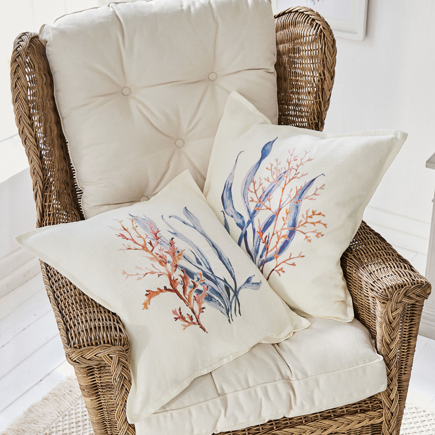 Willkommen in der faszinierenden Unterwasser-Welt. Dieses Kissenhüllen-Set schafft in Ihrem Ambiente ein Wohngefühl, das an die belebende Frische des Meeres erinnert. Die zwei verschiedenen Aquarelldrucke harmonieren fantastisch miteinander – in kühler Farbgebung wirken sie zurückhaltend und elegant, trotzdem fallen sie dem Betrachter sofort ins Auge. Durch das hochwertige Leinengewebe erhalten die Bezüge nicht nur eine betont natürliche Aura, sondern verwöhnen auch mit lebendiger Struktur, weicher Haptik und alltagstauglicher Robustheit. Der abgenähte Zierrand und der mittig gesetzte Knopfverschluss auf der Rückseite sind schöne Details und runden die Textilien ab. Zwei erfrischende und gleichzeitig gemütliche Wohnaccessoires – unverzichtbar für das maritime Küsten-Feeling.