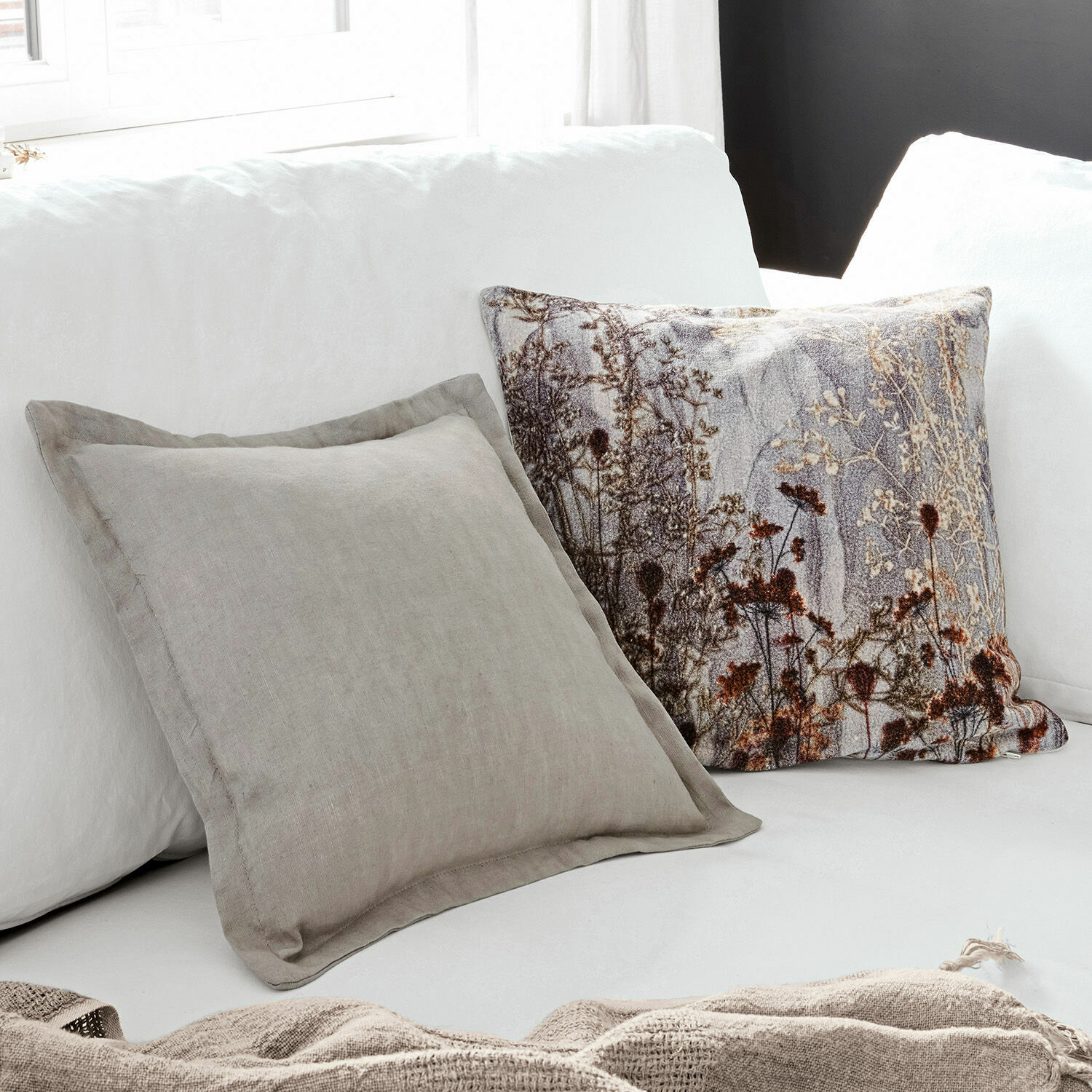 Dass Gegensätze auch wunderbar harmonieren können, beweist dieses Kissenhüllen-Set aufs Schönste. Dabei übernimmt der Kissenbezug aus streichelweichem Samt die Hauptrolle und bringt den naturalistischen Blumenprint auf der Vorderseite mit edler Brillanz zur Geltung. Bei so viel Lebendigkeit darf der andere Bezug durchaus zurückhaltend sein. Nur der breite Saumabschluss rundum setzt einen stilvollen Akzent. Auf Komfort müssen Sie auch hier nicht verzichten. Denn das Mischgewebe aus Leinen und Baumwolle sorgt für eine angenehm weiche Haptik. Beide Textilien sind mit einem praktischen Reißverschluss ausgestattet. Aufgrund der zeitlosen Farbigkeit lässt sich das Duo mit vielen Wohnstilen kombinieren. Probieren Sie es aus. So sind sie beispielsweise auf Ihrer Couch ein stimmungsvoller Blickfang und strahlen eine wunderbare Gemütlichkeit aus.