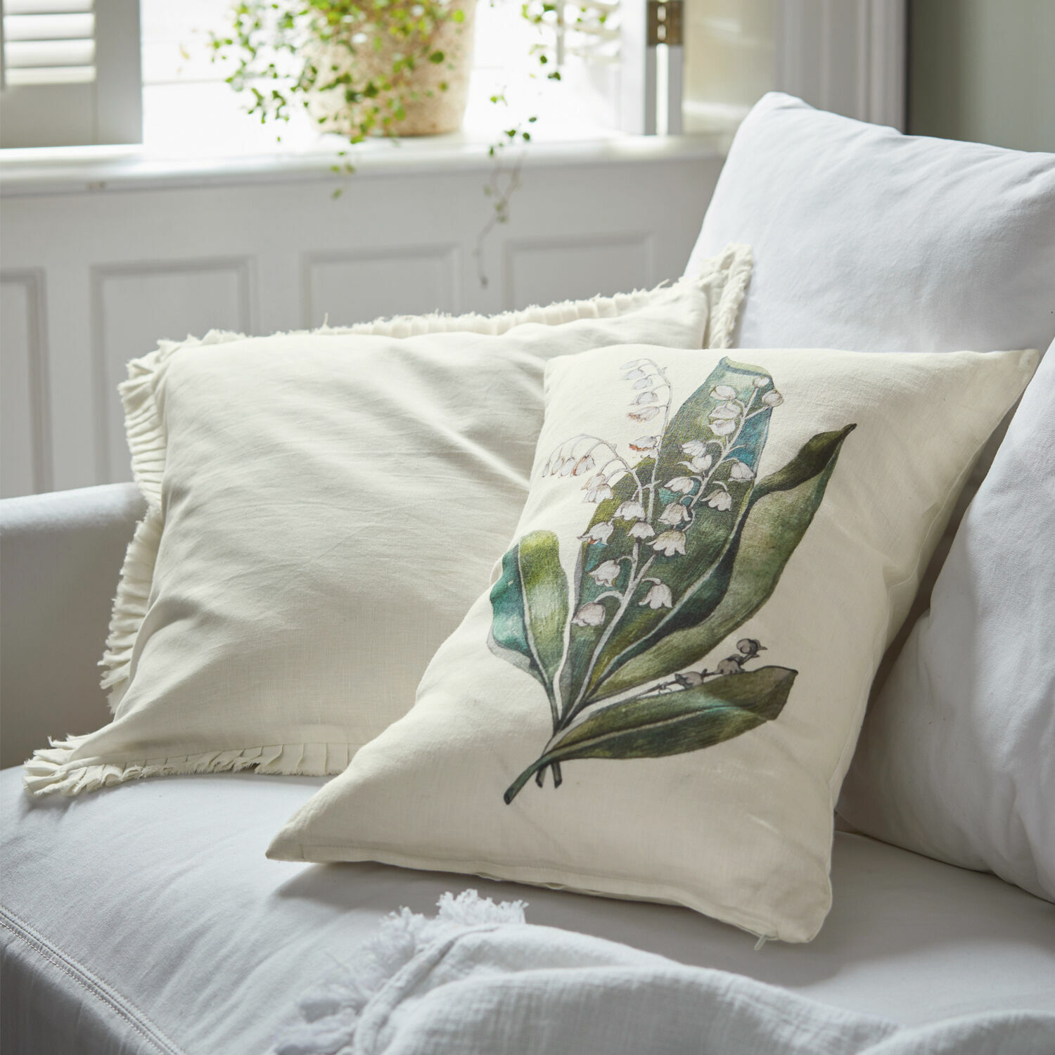 Dieses harmonisch abgestimmte Kissenhüllen-Set steigert die Vorfreude auf den nächsten Frühling um ein Vielfaches. Das liegt vor allem an dem wunderschönen Maiglöckchen-Print, der eines der Bezüge stimmungsvoll aufblühen lässt. Durch den exquisiten Digitaldruck wirkt das Motiv so naturalistisch und frisch wie von einer Blumenwiese gepflückt. Dazu passt die zweite Kissenhülle in Unifarbe einfach wunderbar. Verziert mit einem gefaltelten Steg rundum und einem modisch gefransten Saum setzt es zauberhaft schöne Akzente. Ein perfektes Duo, das nach einer hochwertigen, alltagstauglichen Qualität wie reines Leinen verlangt. Das natürliche Gewebe ist weich in der Haptik, charaktervoll in der Optik und in der Maschine waschbar. Ein praktischer Reißverschluss macht die beiden Bezüge komplett. Unterschiedlich in Design und Größe bringen sie eine Extraportion Gemütlichkeit und Frische in Ihre Einrichtung – ob in der Loggia, auf dem Korbsessel im Flur oder der Küchenbank.
