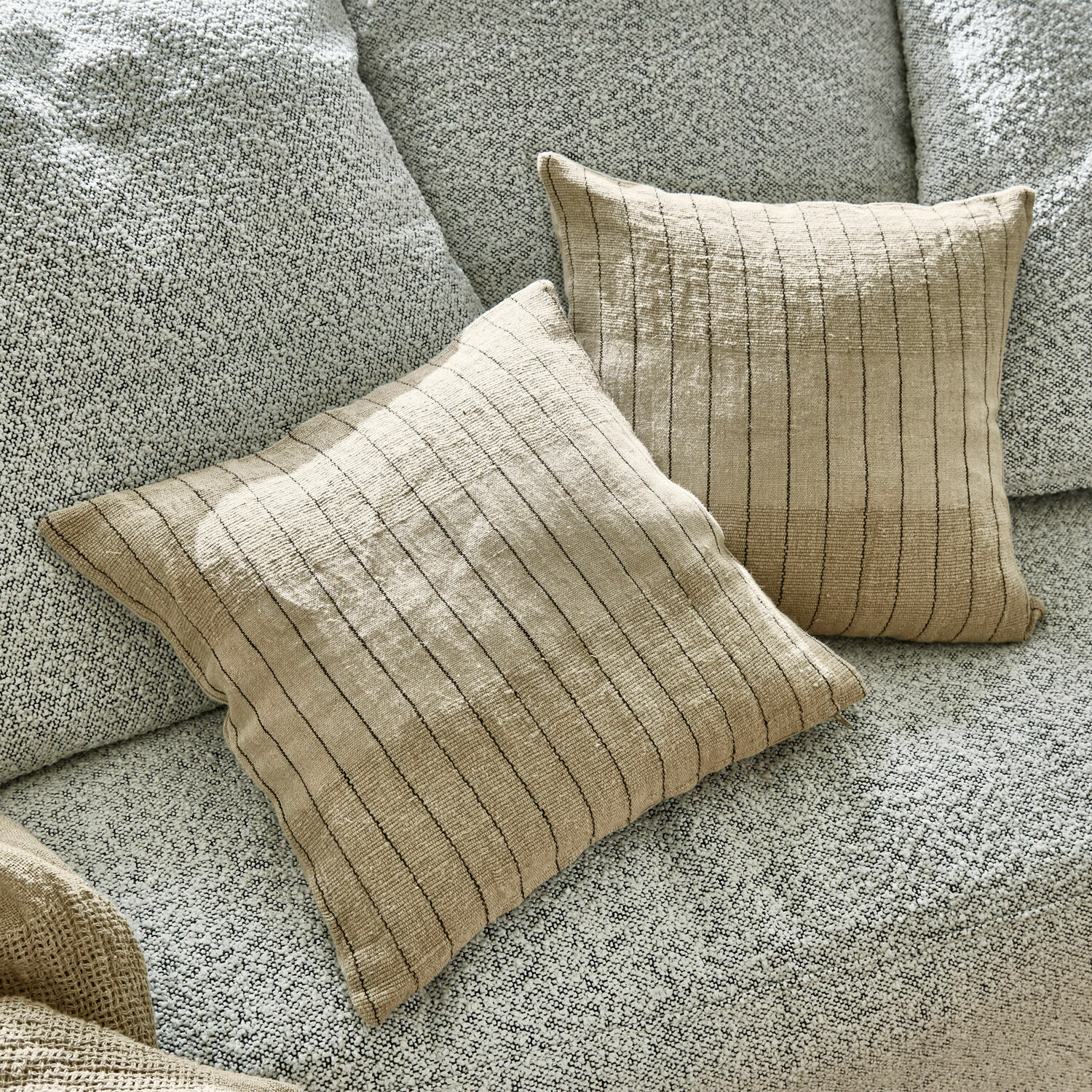 Möbel und Accessoires aus natürlichen Materialien und zurückhaltenden Farben sind zeitlos modern und strahlen eine unwiderstehliche Ruhe und Entspanntheit aus. Dieses Kissenhüllen-Set begeistert nicht nur durch seinen leichten Melange-Effekt, sondern auch durch seine gelungene Farbharmonie, die durch feine schwarze Streifen lebendig in Szene gesetzt wird. Die Rückseite kontrastiert ganz pur in Unifarbe. Was so natürlich und edel aussieht, fühlt sich auch so an. Dafür ist der hochwertige, charaktervolle Leinenstoff in einer äußerst festen Leinwandbindung verantwortlich. Das dichte Gewebe ist absolut unempfindlich, strapazierfähig und abriebfest. So sind die Bezüge perfekt für den Alltag und lassen sich in der Maschine problemlos waschen. Ein praktischer Reißverschluss rundet die Textilien ab. Einzeln oder als Duo sind die Zierkissen elegant dezente Wohnakzente, die viel Gemütlichkeit auf die Couch oder den Lieblingssessel bringen. Und das Schönste: Sie vertragen sich mit nahezu jedem Wohnstil.
