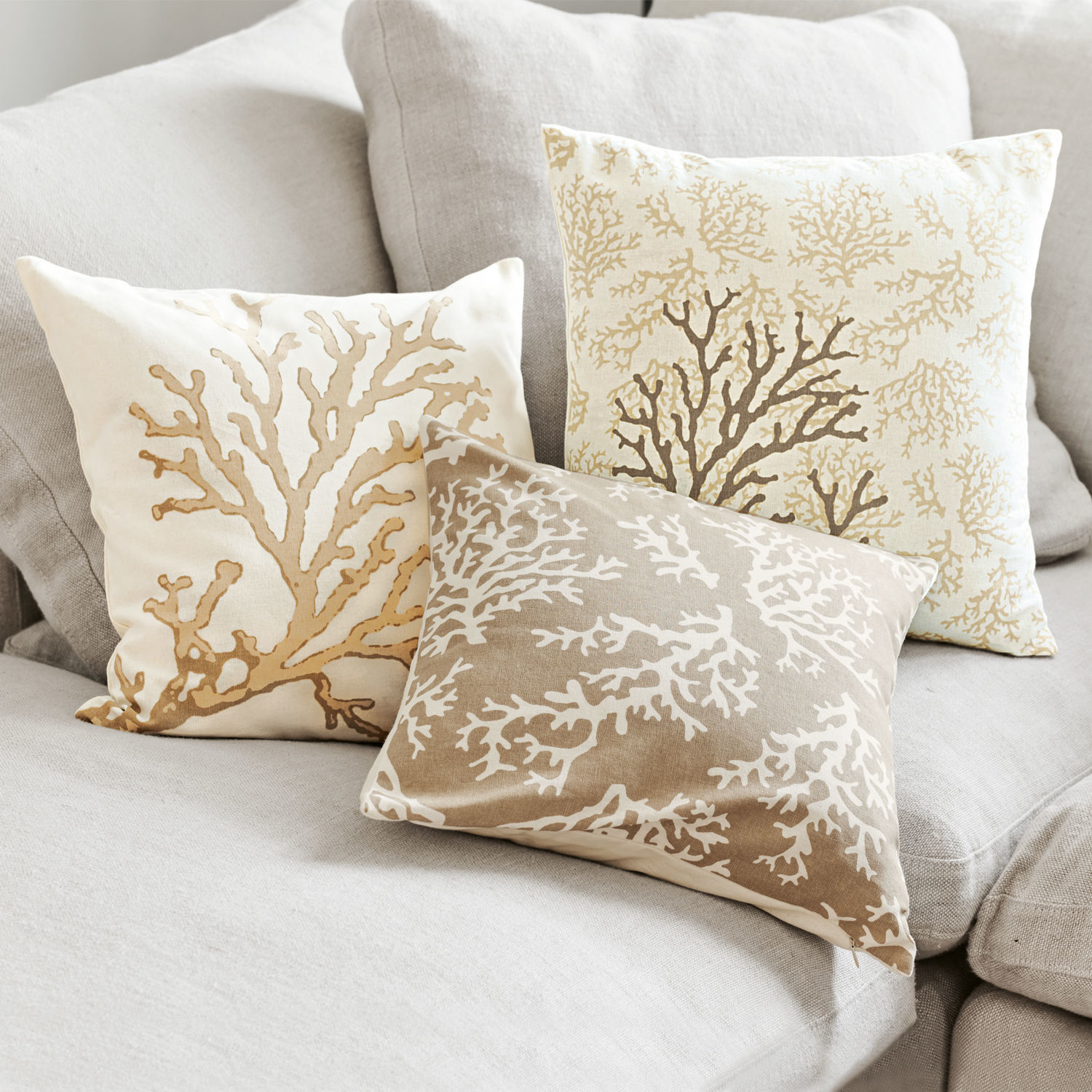 Ein dekoratives und elegantes Trio mit viel sommerlichem Charme. Die drei wunderhübschen Kissenhüllen aus weicher reiner Baumwolle zieren unterschiedliche Korallen-Prints, welche die Sommerfrische in Ihr Zuhause zaubern. Machen Sie ganz normale Kissen damit zu echten Schmuckstücken. Denken Sie an eine farbenprächtige Unterwasserwelt und fühlen Sie sich bei diesem Anblick ein wenig wie in den Sommerferien. Ein geschmackvolles Detail für heimelige Kuschelmomente, welches Ihr Zuhause noch gemütlicher macht. Die drei attraktiven Hüllen sind jeweils mit einem Reißverschluss versehen.
