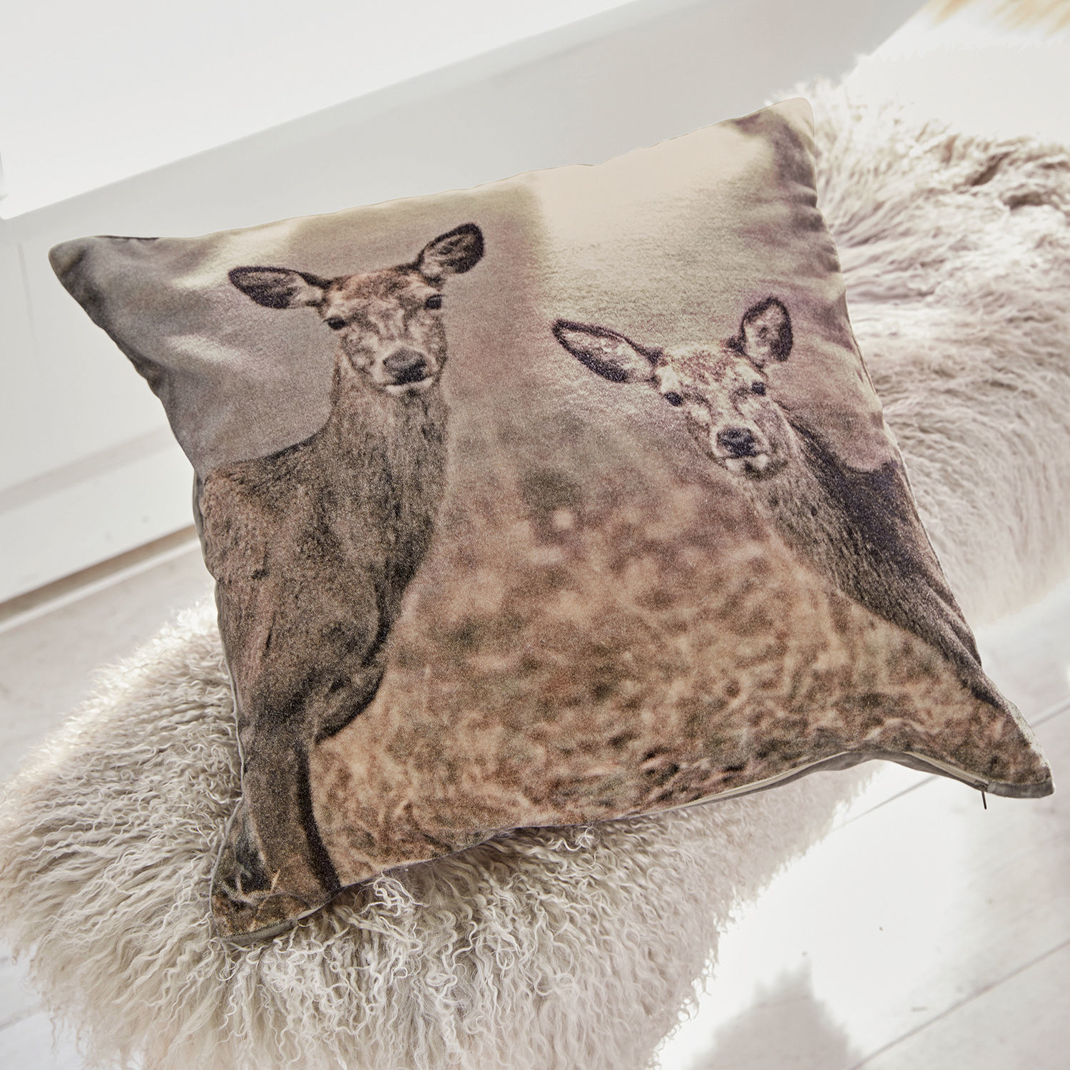 Rehe wecken eine vertraute Stimmung und erfreuen sich in Form von Fotodrucken immer größerer Beliebtheit. Auch bei diesem zauberhaften Motiv spielen die scheuen Paarhufer die Hauptrolle und verleihen der Kissenhülle ihre außergewöhnliche Aura. Durch den innovativen 3D-Digitalprint sehen die Tiere täuschend echt aus, fast so, als würden Sie ihre Neugier wecken und Ihnen alle Aufmerksamkeit widmen. Der Bezug aus hochwertigem, fein schimmerndem Baumwollsamt setzt den Druck besonders brillant in Szene. Auch der schmeichelweiche Flor ist unwiderstehlich und avanciert das Kissen zu einem echten Kuschelstück. Die unifarbene, farblich abgestimmte Rückseite und ein praktischer Reißverschluss runden die Kissenhülle ab. Ein origineller Deko-Akzent, der mit dem Einrichtungstrend Natural Look aufs Schönste harmoniert – als Blickfang auf der Couch, auf dem gemütlichen Sessel oder auf der Kaminbank. Dank des edlen und neutralen Farbspektrums lässt sich das Textil vielseitig kombinieren.