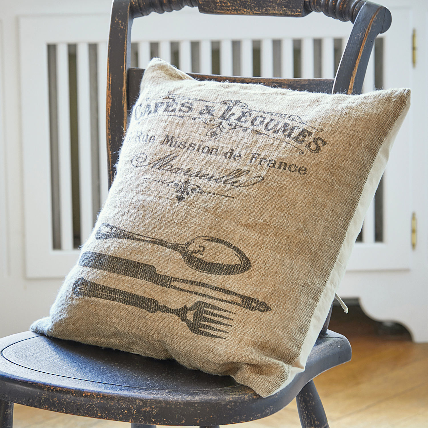 Auch Heimtextilien prägen den Stil einer Einrichtung – und sie können eine Wirkung im Raum entfalten, die sofort ins Auge fällt. Das beweist auch diese einzigartige Kissenhülle, die schon durch den dekorativen Vintage-Druck Cafés & Légumes Ihre Vorliebe für französische Nostalgie verrät. Das gelungene Zusammenspiel zweier Qualitäten erzeugt dabei nicht nur eine zeitgemäße Natürlichkeit, sondern auch einen besonderen Reiz: Während sich die Vorderseite in grobem Leinen mit charaktervoller Struktur zeigt, kontrastiert die Rückseite in feinerem Baumwollgewebe. Beide Materialien werden Sie von ihrer ästhetischen Optik, angenehmen Haptik und alltagstauglichen Strapazierfähigkeit überzeugen. Vier Bindebänder auf der Rückseite sorgen für einen stilvollen und gleichzeitig praktischen Verschluss. Ein wohnliches Accessoire und Hingucker in jedem Vintage-Interieur – am schönsten auf der gemütlichen Sitzbank in der Küche oder im Esszimmer.