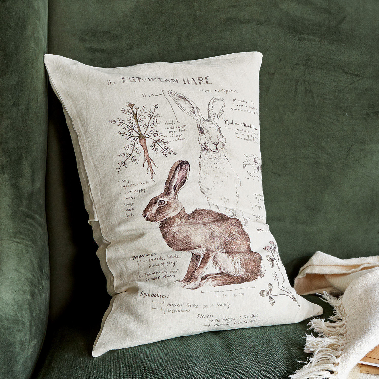 Zur Osterzeit werden auch gemütliche Wohntextilien zum romantischen Stilmittel und versprühen einen ganz besonderen Reiz. Dieses Deko-Kissen lässt die Herzen aller Hasenfreunde höher schlagen und begeistert mit einem Nostalgie-Print, der an einen Auszug wie aus dem Lehrbuch erinnert. Hier wird alles Wichtige in Wort und Bild dargestellt – von der Anatomie bis hin zu den bevorzugten Futterpflanzen der lieblichen Tiere. Zum natürlich anmutenden Druck passt auch die natürliche Qualität: Das Leinengewebe weist eine charaktervolle Struktur auf, ist weich in der Haptik und strapazierfähig im Gebrauch. Praktische Knöpfe machen die Kissenhülle komplett. Ein origineller Deko-Akzent, der alle Blicke auf sich zieht – und wunderbar mit dem Vintage-Chic oder Landhaus-Look harmoniert. Ihrem Sofa, dem Lieblingssessel oder der Gartenbank unter dem blühenden Kirschbaum verleiht das Kissen eine einladende Behaglichkeit und macht die Ostertage mit Ihren Liebsten noch ein bisschen stimmungsvoller.