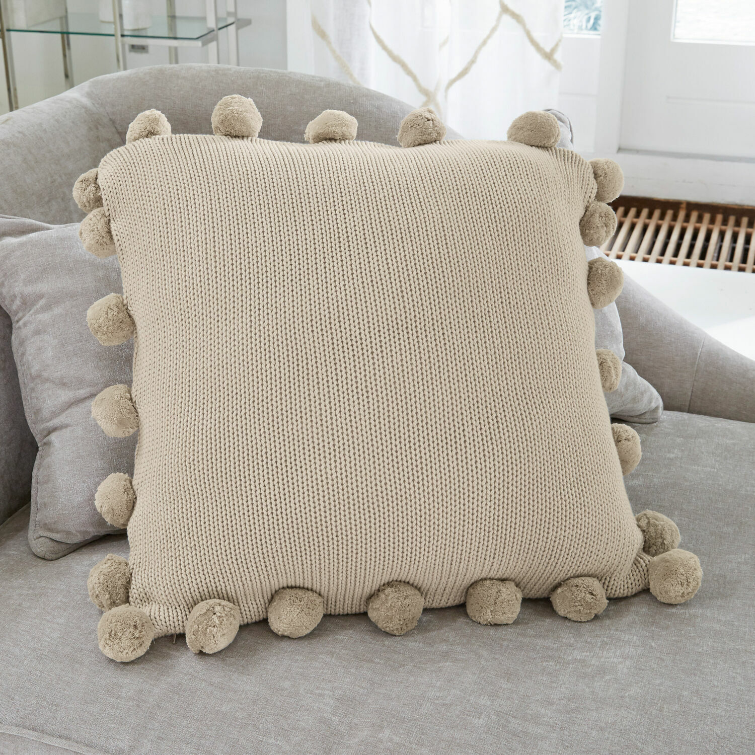 Kissen kann man nie genug haben. Umso schöner, wenn sie sich so kuschelig und spannend im Detail präsentieren wie diese Kissenhülle aus hochwertigem Strick. Wohntextilien aus Strick sind hoch aktuell. Kein Wunder, ihre Optik versprüht eine wohnliche Behaglichkeit und Wärme, ihre schöne Grobstruktur sorgt für eine fantastische Haptik. Mit diesem Strickkissen aus reiner Baumwolle holen Sie sich auch ein Stück Natur nach Hause. Das Garn ist wunderbar weich und garantiert eine alltagstaugliche Robustheit und Langlebigkeit. Die puscheligen Wollbommeln verleihen das schmückende Etwas und säumen die Kanten mit charmanter Verspieltheit. Komplettiert wird der Bezug durch einen praktischen Reißverschluss. Ein traumhaft schöner Wohnakzent, der keine Wünsche offen lässt – besonders wenn Sie sich gerne mit Möbeln und Accessoires in zurückhaltenden Naturtönen umgeben. Dazu empfehlen wir das passende Plaid Nr. 19862.
