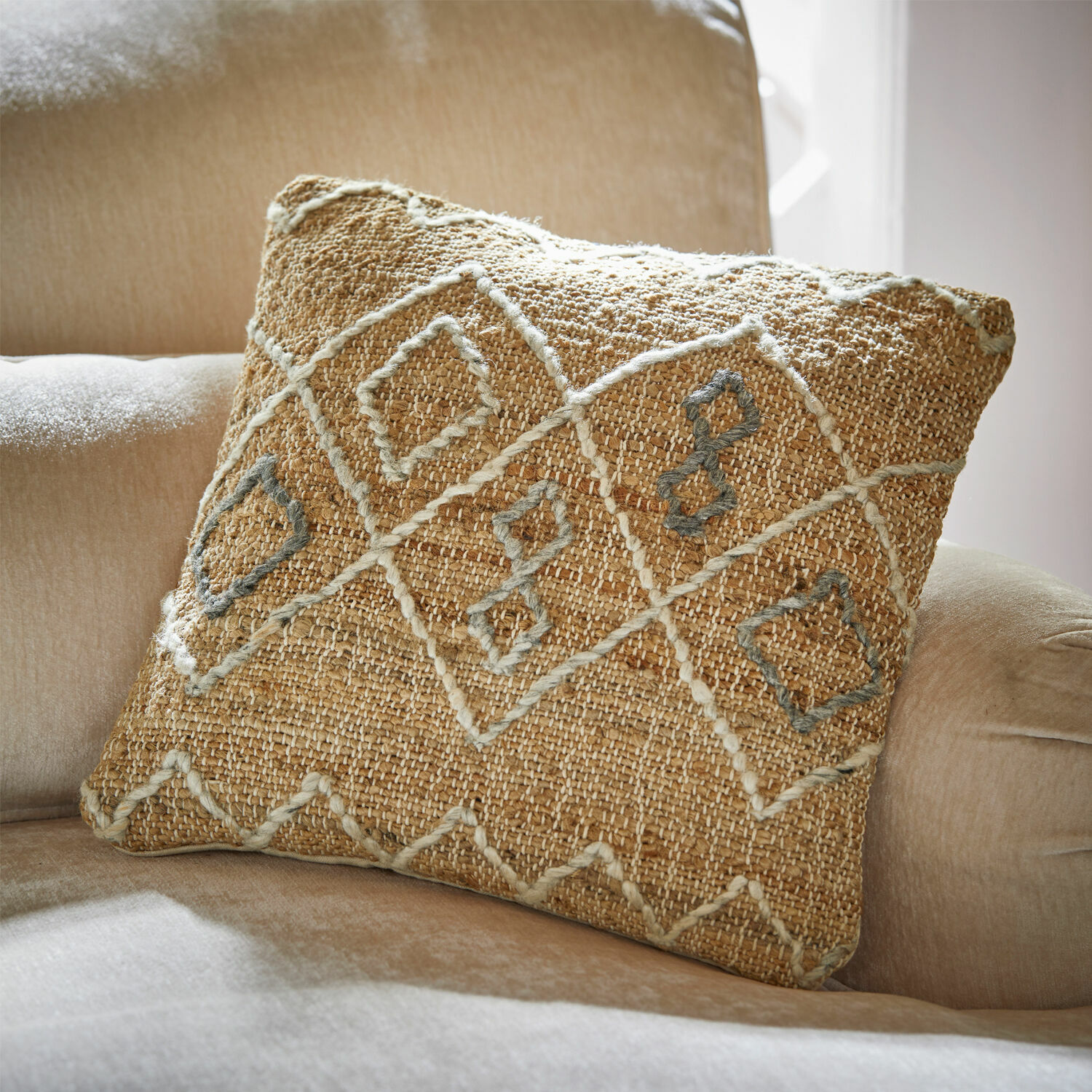 Möbel aus hellem Massivholz, Accessoires aus natürlichen Materialien und dazwischen wohnliche Akzente wie diese Kissenhülle im Ethno-Stil. Das Textil passt ideal in helle, stimmig eingerichtete Räume und macht die Couch oder den Sessel erst richtig gemütlich. Genießen Sie den hochwertigen Mix zweier Naturqualitäten: die Vorderseite aus strapazierfähigem Hanfgewebe, die Rückseite aus Baumwoll-Canvas. Zum Blickfang wird das vorderseitige Rautenmuster – mit dicker Filzwolle aufgestickt, sorgt es für eine schöne erhabene Struktur. Ein praktischer Reißverschluss macht den Bezug komplett. Ein vielseitiges Wohn-Extra, das sich mit weiteren Kissen in Unifarbe oder Ethno-Mustern wunderbar ergänzen lässt. So entsteht eine attraktive Stimmung, durch die Wohnen noch abwechslungsreicher wird. Das passende Pendant zum Teppich Nr. 20346.