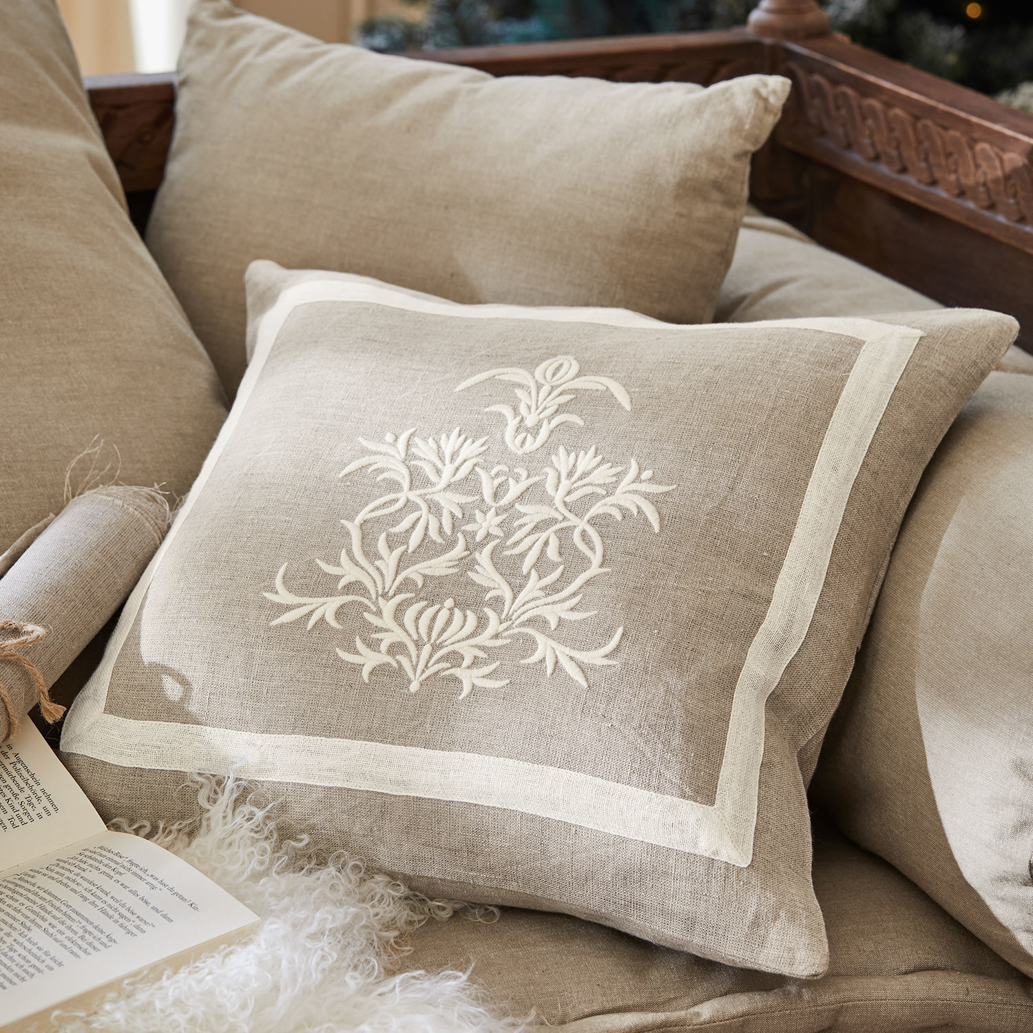 Die Vorderseite der Kissenhülle aus reinem Leinen ziert eine liebevoll gearbeitete Ornament-Stickerei. Gerahmt wird die edle Handarbeit von einer aufgesteppten Kontrastblende. Beides verleiht dem Kissen eine elegante Optik – passend zu einer Einrichtung im Landhaus-Stil oder zu einem klassischen Ambiente. Praktisches Detail: Am Rücken ist der unifarbene Kissenbezug mit Knöpfen zu schließen.