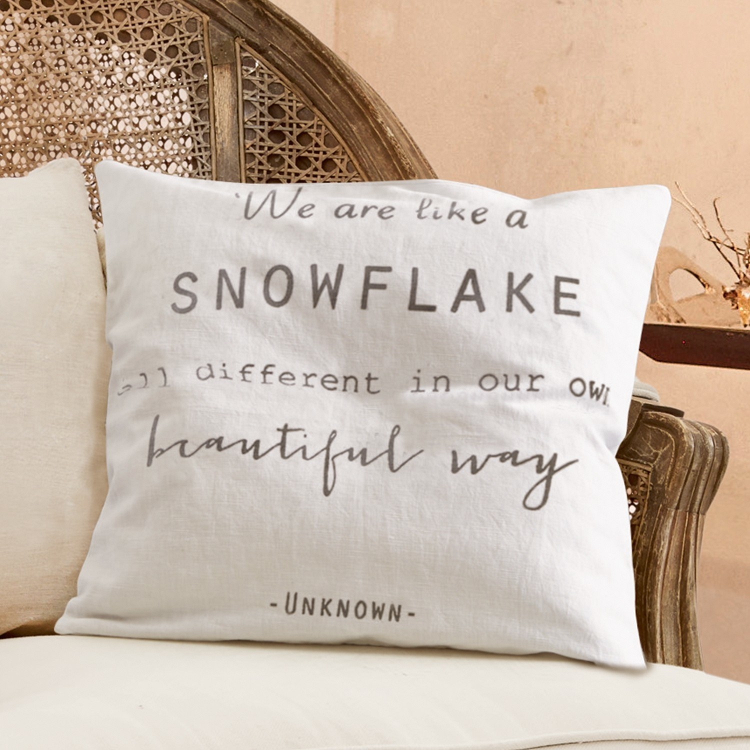 Pur, klar und dabei dennoch tiefsinnig: Auf hochwertigem reinen Leinen wurde ein winterliches Zitat aufgebracht, das an wirbelnde Schneeflocken denken lässt. Gleichzeitig feiert es die persönliche Individualität jedes Einzelnen von uns. Eine schöne Botschaft, gerade jetzt im grauen Winter. Verschiedene Schriften wirken im charmanten Zusammenspiel besonders dekorativ. Dank eines verdeckten Reißverschlusses lässt der Bezug sich ganz leicht wechseln. Er wertet jedes Kissen im Handumdrehen auf und macht es zum geschmackvollen Highlight. Ideal zu skandinavischen Interiors, dem gemütlichen Landhaus-Stil sowie zum verträumten Shabby-Chic. So wird Ihr Kuschelkissen zum allerliebsten Begleiter im Winter. Auch eine sehr nette Geschenkidee für liebe Menschen.