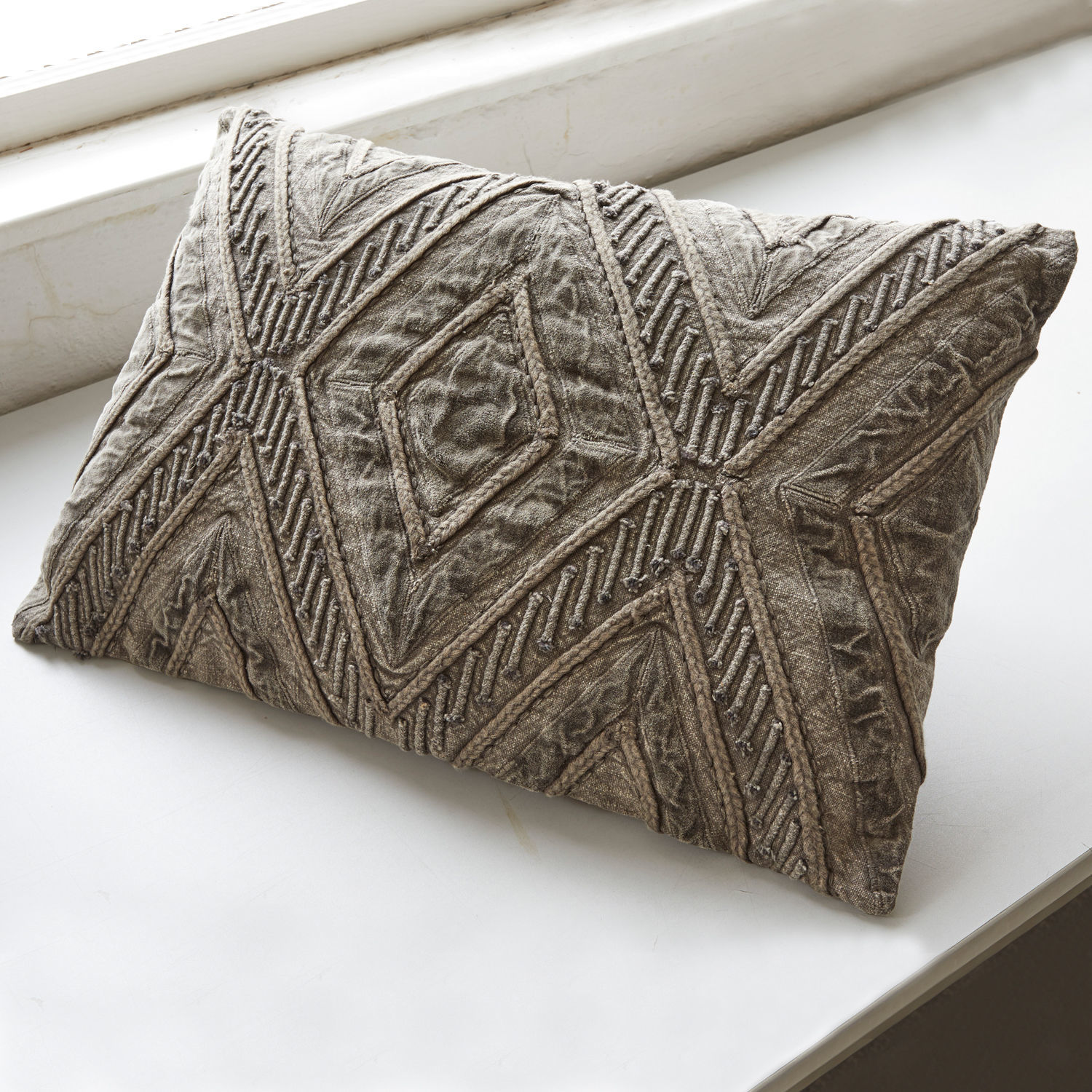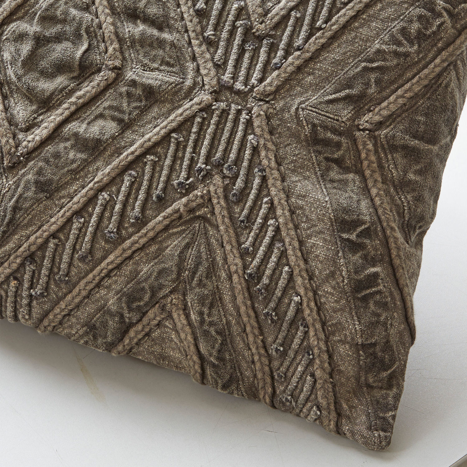 Das Anfertigen von kostbaren Stickereien war in früheren Jahrhunderten für das weibliche Geschlecht oft die einzige Möglichkeit, ihrer Kreativität Ausdruck zu verleihen. Und betrachten wir diese Kissenhülle, sehen wir eine vornehme Dame, die sich hingebungsvoll ihrer Handarbeit widmete und kleine Kunstwerke erschuf. Kunstwerke wie diese Kissenhülle, die wie ein kostbares Relikt aus jenen Tagen wirkt. Denn nur noch äußerst selten trifft man heutzutage auf solche textilen Prachtstücke. Die Kissenhülle präsentiert sich mit einem opulenten Design auf der Vorderseite, das aus dem Zusammenspiel verschiedener Texturen und aufwendiger Stickerei entstanden ist. Das prägnante Rautenmuster erinnert ein wenig an die klassischen Kelims, ist hier aber nicht gewebt, sondern genäht. Außerdem verzichtet es auf den Einsatz kräftiger Farben, sondern betont durch die eleganten, zurückhaltenden Farb-Nuancen und den dezent verwaschenen Look den antiken Charakter. Die Rückseite des Kissens ist weniger aufwendig gearbeitet, rundet mit dem sanft schimmernden Gewebe in Rohseidenoptik den edlen Auftritt aber perfekt ab. Das Kissen setzt einen exklusiven Akzent im Wohnraum, es verleiht aber auch einem Schlafraum nobles Flair. Dank des verdeckten Reißverschlusses lässt sich die Kissenhülle bei Bedarf sogar abziehen.