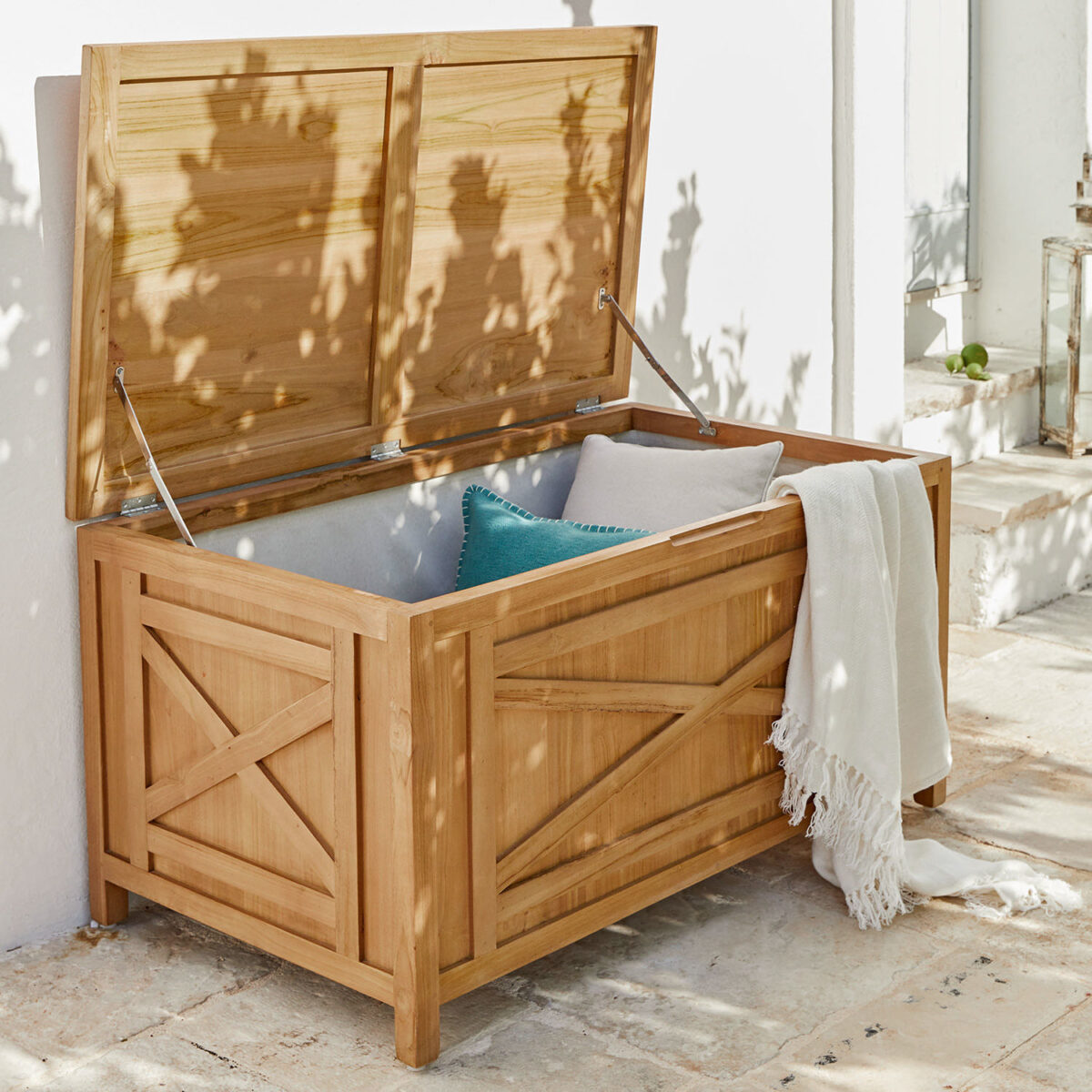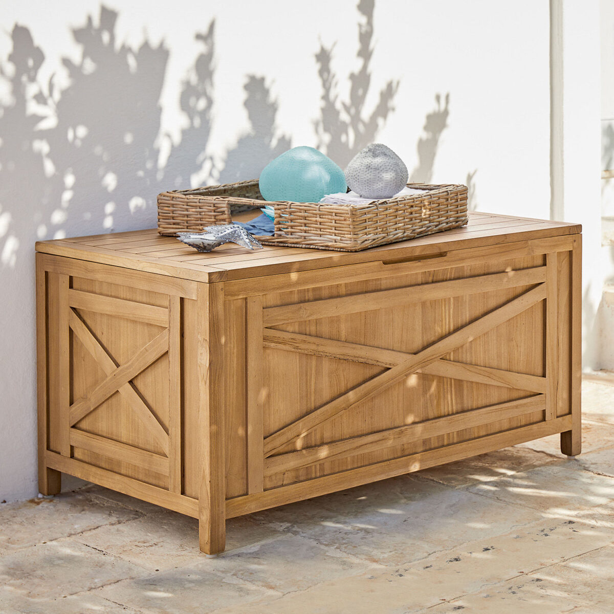 Diese schöne, geräumige Teakholztruhe ist ideal zum Verstauen von Kissen, Bettwäsche oder Wolldecken. Ob nun im Indoor- oder im Outdoor-Bereich. Die Truhe ist mit drei robusten Metallscharnieren und zusätzlichen Sicherheitsbeschlägen ausgestattet, sodass sie beim einfachen Öffnen nicht gleich wieder zufällt. So hält der Deckel sicher in einer offenen Position, sodass Sie Ihre Sachen bequem verstauen können. Das mit Stoff ausgekleidete Interieur schützt den Inhalt, deshalb ist auch die Aufbewahrung von empfindlichem Material kein Problem. Neben der besonderen Funktionalität punktet die Truhe auch mit einer stilvollen Optik, welche die hochwertige Verarbeitungsqualität unterstreicht. Die wunderschön symetrischen und harmonisch angeordenten Streben auf der Holzoberfläche sind einfach hübsch anzusehen. Das Teakholz wurde sehr sanft veredelt, damit die feine Maserung unverfälscht zur Geltung kommen kann. So kann die Truhe mit Schönheit punkten und bietet dank der wunderbaren Robustheit des Materials Ihren Kissen und Auflagen einen geschützten Unterschlupf.