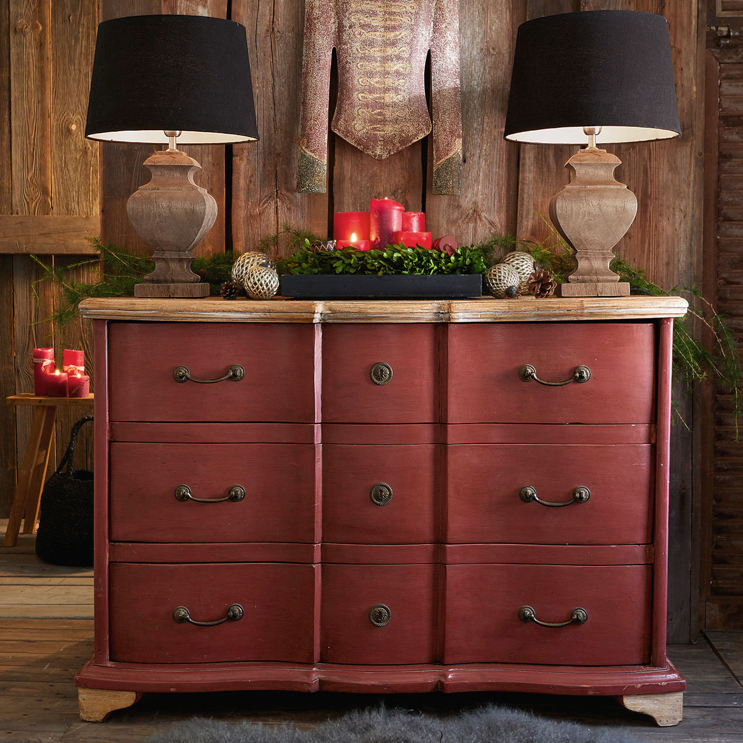 Die klassisch geschwungene Kommode aus Mangoholz sorgt mit großzügigen Schubladen für ausreichend Stauraum. Die kombinationsstarke Farbe und das matte Antik-Finish sind derweil typische Merkmale für die Herkunft des Möbelstücks. Denn genauso gut könnte es auch in einem französischen Chalet in der Provence stehen. Die patinierten Beschläge und Metallgriffe unterstreichen den charmanten Antik-Look.