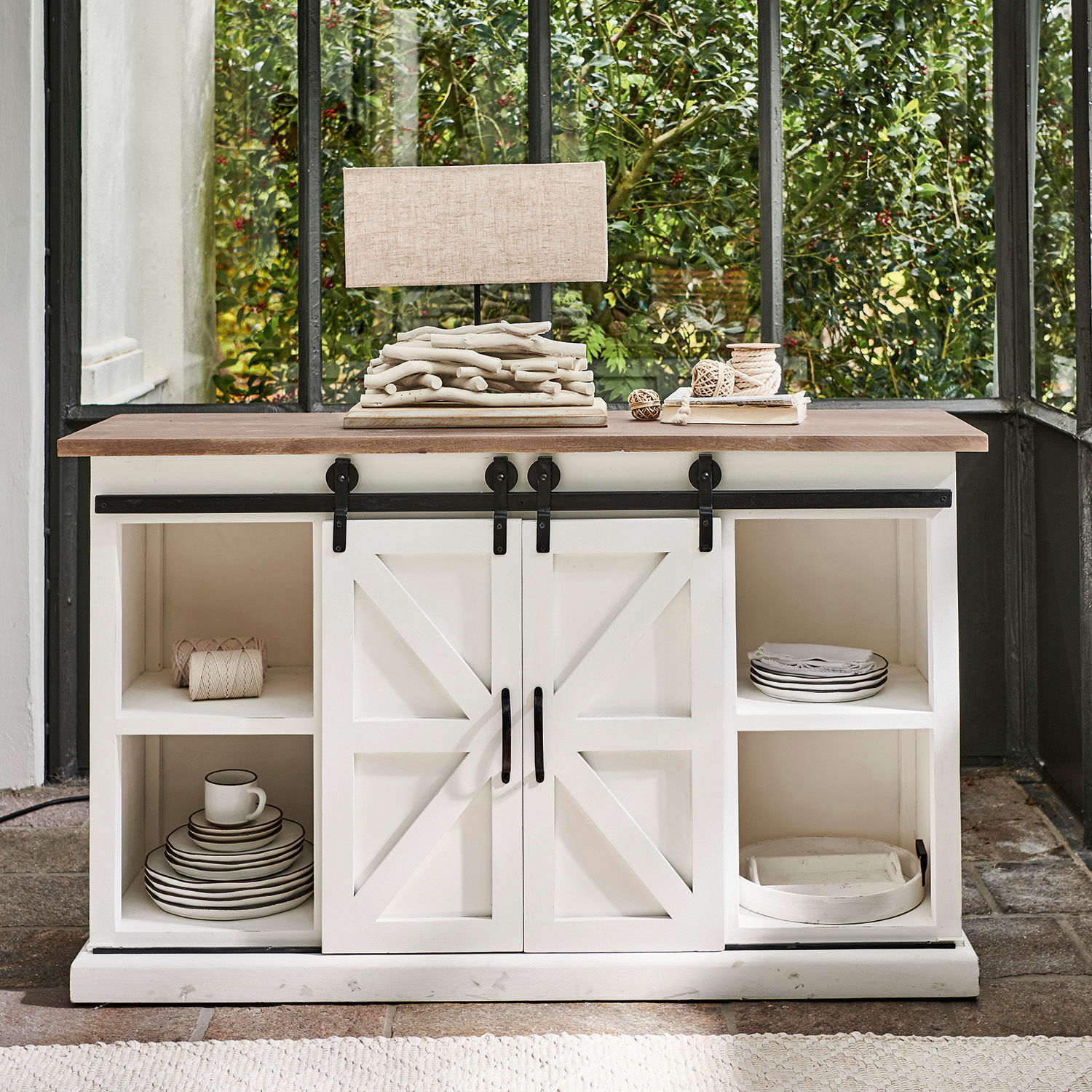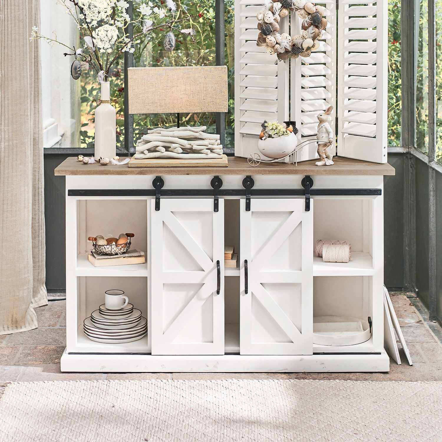 Verliebt ins Landleben? Dann darf eine Kommode wie diese in Ihren Räumen nicht fehlen. Sie spielt gekonnt mit dem Kontrast aus weißem Korpus und naturfarbener Holzplatte – eine trendige Kombination, die sehr wohnlich wirkt und zugleich eine frische Note ins Ambiente bringt. Wie es früher in jedem Handwerksbetrieb Tradition war, wurde auch dieses Möbelstück in vielen Arbeitsschritten und mit erkennbarer Liebe zum Detail gefertigt. So sind die beiden Türen mit typischen Landhaus-Elementen verziert und auch der stabile Rahmen am Boden verleiht der Kommode die Standfestigkeit von Möbeln, die mehr als einer Generation von Nutzen sind. Neben ihrer prägnanten Optik wird sich die Kommode aber auch mit ihren praktischen Vorzügen bei Ihnen beliebt machen. Da sind vor allem die Türen, die nicht – wie üblich – als klassische Flügeltüren konstruiert sind. Vielmehr laufen sie als Schiebetüren an einer stabilen Eisenstange. Das hat den Vorteil, dass Sie die Kommodentüren öffnen und sogar mal offenstehen lassen können, ohne dass sie in einem engen Durchgang im Weg sind. Da ist aber auch das Material: hochwertiges Mangoholz, das nicht nur sehr stabil und langlebig ist, sondern als Nebenprodukt des Obstanbaus auch als ökologisch wertvoll gilt. Dieses charakterstarke Möbelstück behauptet sich in den verschiedensten Raumsituationen und bietet im Wohnraum wie im Speisezimmer, im Flur wie im Schlafzimmer viel Stauraum hinter seinen Türen.