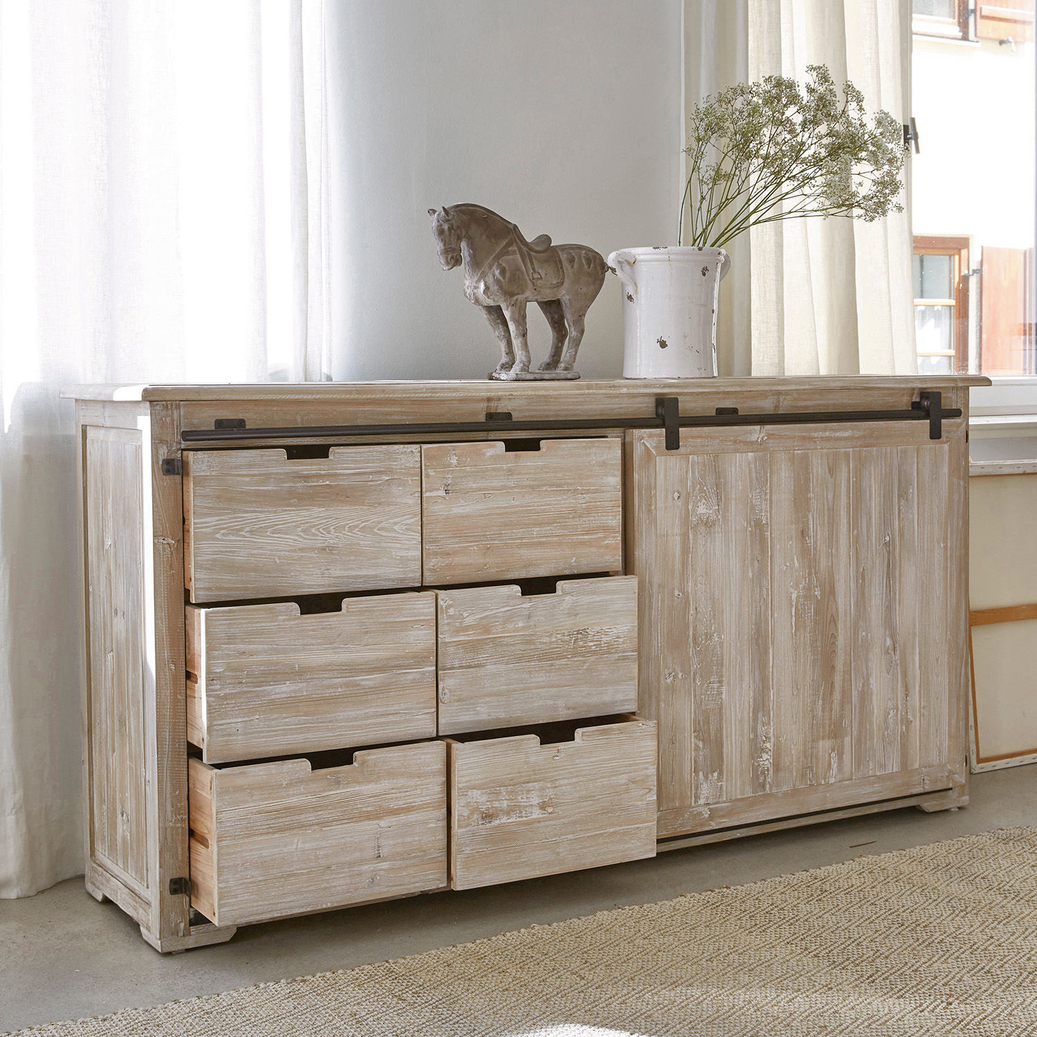 Möbel aus Holz gehören einfach zum Landhaus-Stil, denn nichts verbreitet so einladende Gemütlichkeit wie dieses Naturmaterial. Deshalb wurde bei dieser Kommode auch bewusst auf schmückende Details wie Schnitzereien und andere Verzierungen verzichtet – vielmehr darf hier allein das Holz mit seiner natürlichen Ausstrahlung die Hauptrolle spielen. Diese Aufgabe erfüllt das wiederaufbereitete Tannenholz mit seiner markanten Maserung meisterlich, unterstützt von einem dezenten, antikweißen Finish, das zugleich für einen frischen Akzent im Raum sorgt. Doch eine Kommode wird nicht nur wegen ihres ansprechenden Designs gewählt, sondern sie hat auch wichtige Aufgaben zu erfüllen: In den Schubladen und in den Fächern hinter der Schiebetür können die verschiedensten Utensilien ordentlich untergebracht werden, je nachdem, wo die Kommode zum Einsatz kommt. Und in dieser Beziehung erweist sie sich als absolut flexibel. Sie macht sich gerne im Schlafraum nützlich, wo sie Wäsche, Pullover und ähnliches beherbergt, sie passt aber auch hervorragend in den Eingangsbereich des Hauses. Sie suchen eine Kommode fürs Büro? Gerne bietet sie auch Aktenordnern, Rechnungsmappen und anderen Unterlagen einen stilvollen Platz, während das Holz einen natürlich schönen Kontrapunkt zu modernen Büromöbeln aus Stahl und Alu setzt. Die Schiebetür ist übrigens nicht nur ein gestalterischer Gag, sie macht die Kommode zum perfekten Möbelstück auch für kleinere Räume und enge Flure.