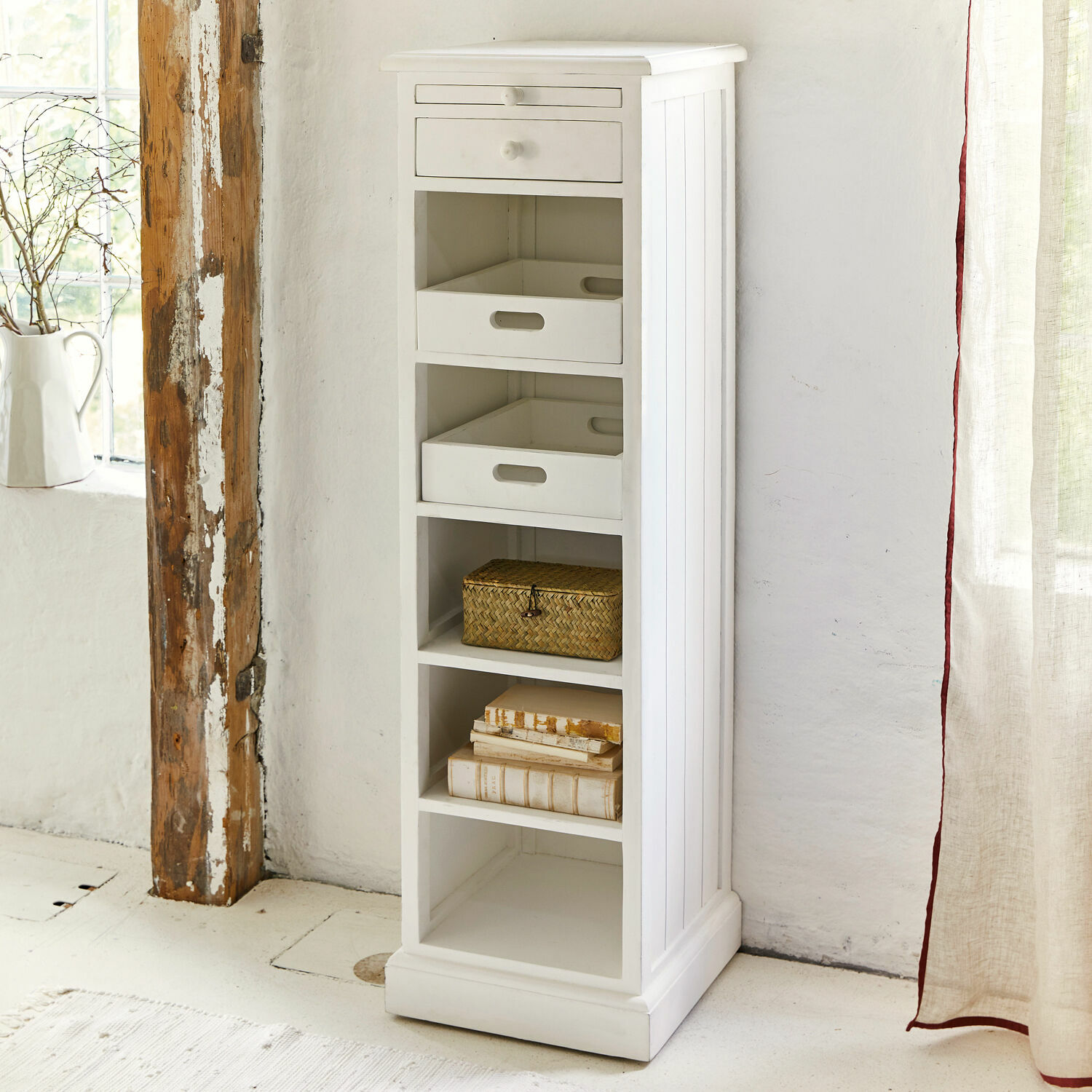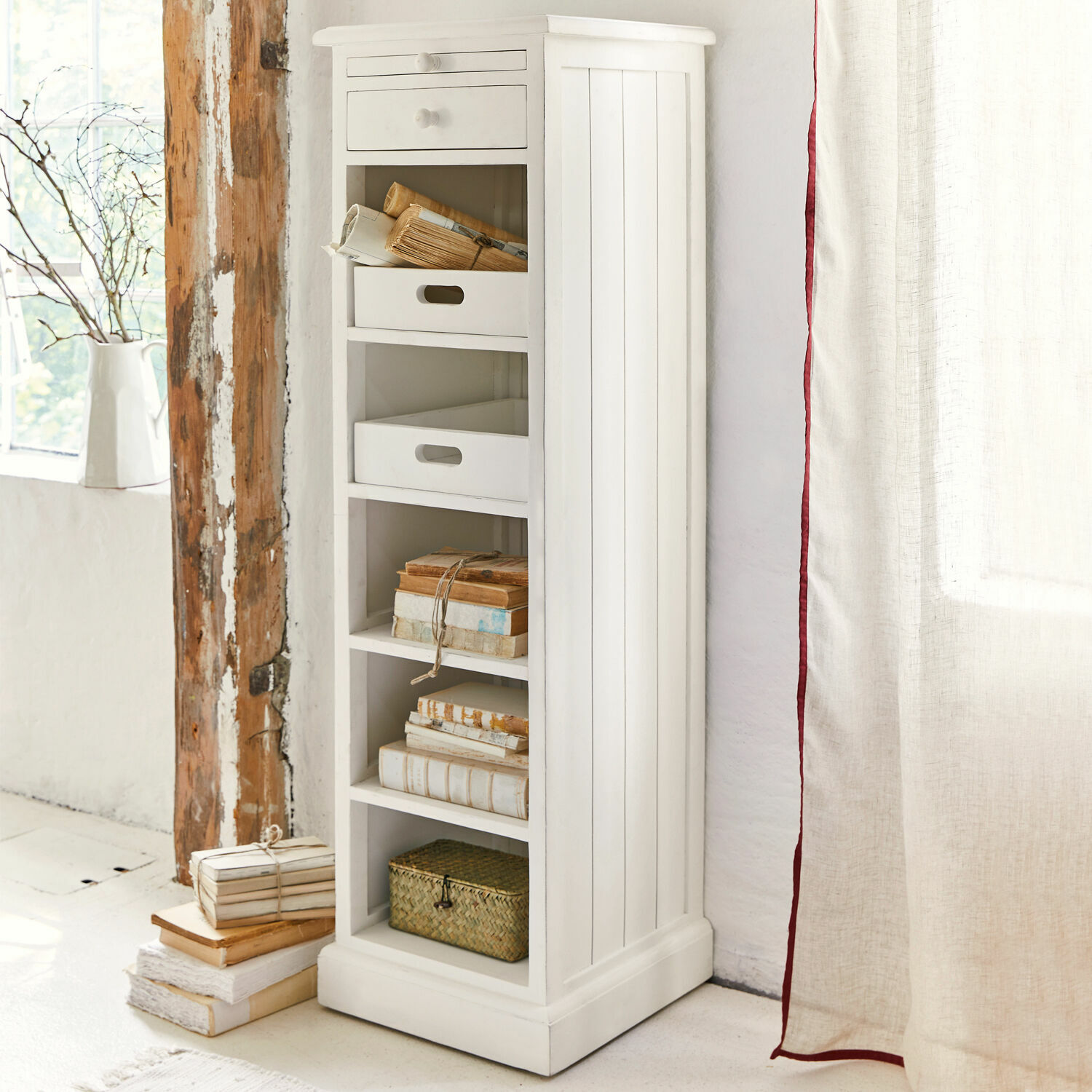 Was von weitem wie eine hübsche Kommode aussieht, die in ihren Fächern viel Platz für dies und das und jenes bietet, ist in Wahrheit ein Möbelstück, das bei näherem Hinschauen noch mit weiteren Talenten überrascht. Über den beiden oberen Schubladen wurde nämlich eine stabile Schreibunterlage integriert, die Sie bei Bedarf herausziehen können. Um schnell die Post darauf abzulegen, die Liste für den Wocheneinkauf zu schreiben oder das Tablet darauf abzulegen, um Emails zu checken oder etwas zu googeln. Bei aller Begeisterung über die integrierte Schreibunterlage wollen wir aber auch die Vorzüge der Kommode als Stauraum nicht unerwähnt lassen, den sie in den offenen Fächern mit den zwei mobilen Kästen und der Schublade bietet. Es könnte sogar sein, dass Ihnen die Wahl des Standortes schwerfällt, denn die Kommode im französischen Landhaus-Look sieht in einem Flur ebenso bezaubernd aus wie im Wohn-/Essbereich oder im Schlafzimmer. Selbst in einer Landhaus-Küche wird sich noch ein Plätzchen für die schlanke Kommode finden lassen, die in bester Handwerksqualität aus robustem Mangoholz gefertigt wurde und der dezente Gebrauchsspuren die charmante Shabby-Note verleihen.