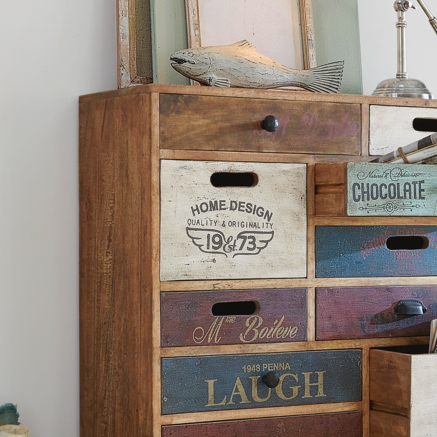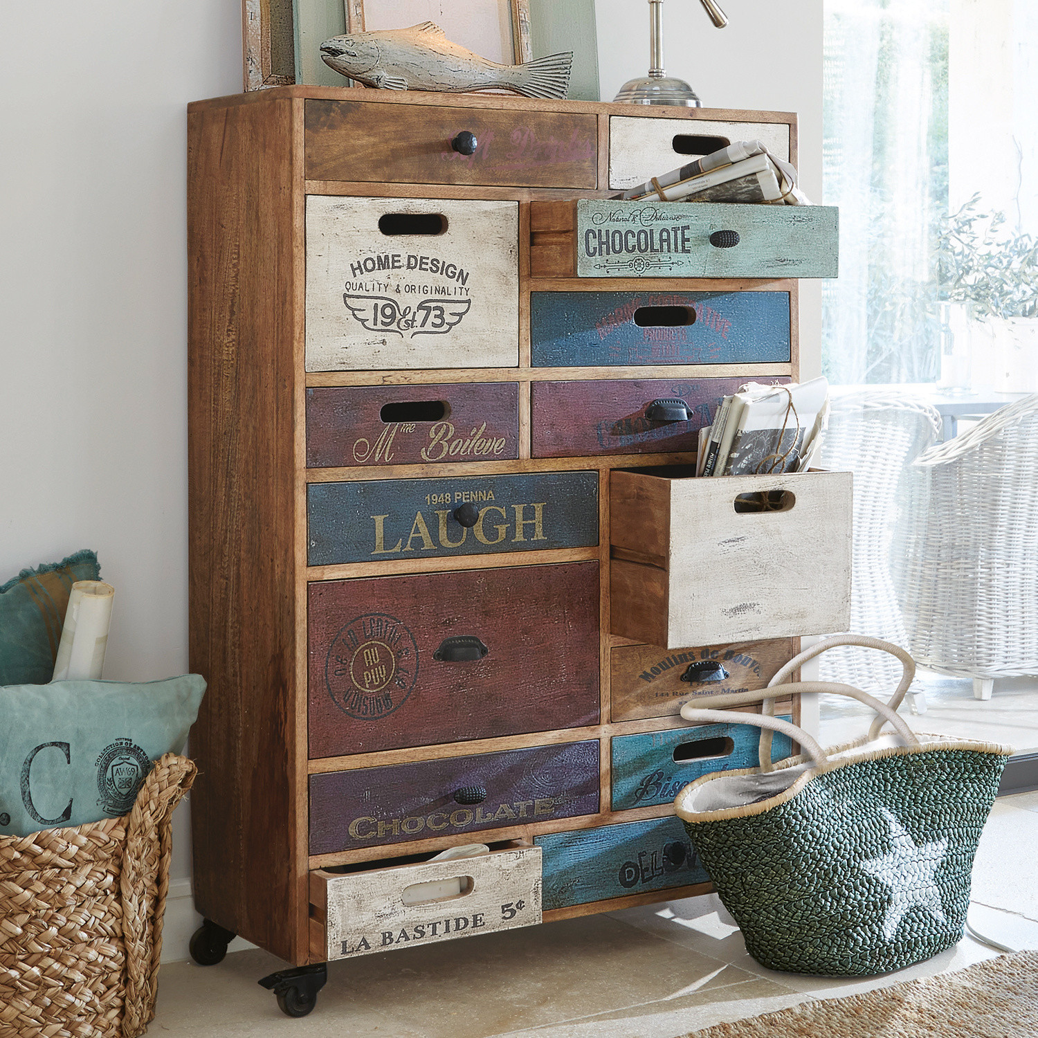 Ein außergewöhnliches Möbelstück mit farbenfrohen Fronten und charmanten Vintage-Drucken. Aus Mangoholz, mit 15 unterschiedlichen Schubladen und dank Rollen […]