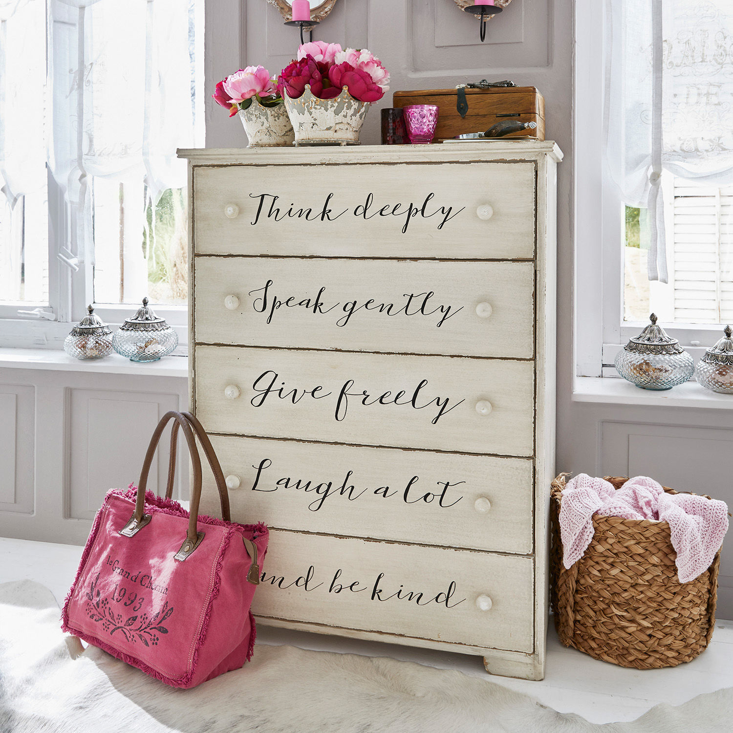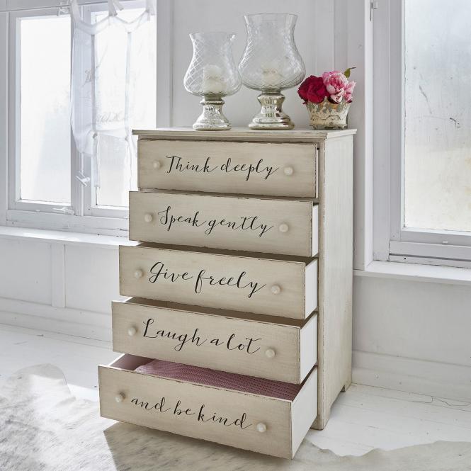 Die fünf Schubladen sind hübsch mit Sprüchen bedruckt. Verspieltes Design im Vintage-Look. Dieses zauberhafte Möbelstück ist ein wahrer Hingucker. Jede der fünf […]